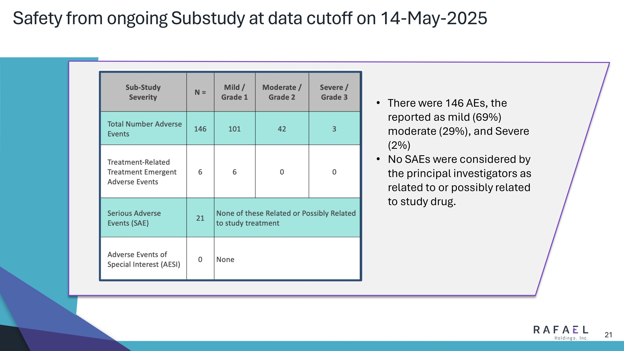 21 Safety from ongoing Substudy at data cutoff on 14 - May - 2025 • T here were 146 AEs, with the majority reported as mild (69%) or moderate (29%), 3 reported as severe and the remainder reported as Serious Adverse Events(SAEs) (14%); and • No SAEs were considered by the principal investigators as related to or possibly related to study drug.