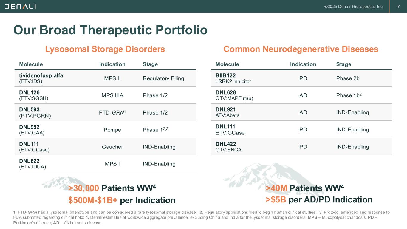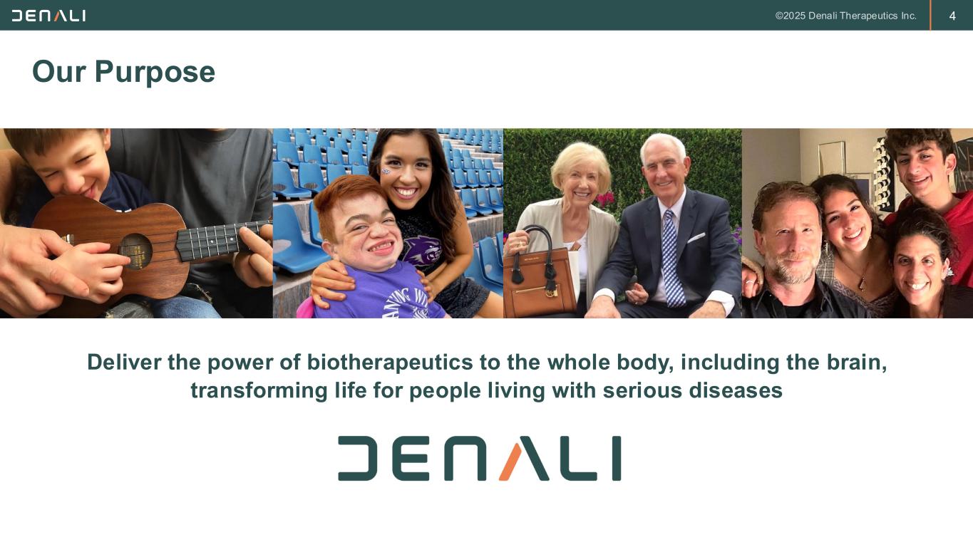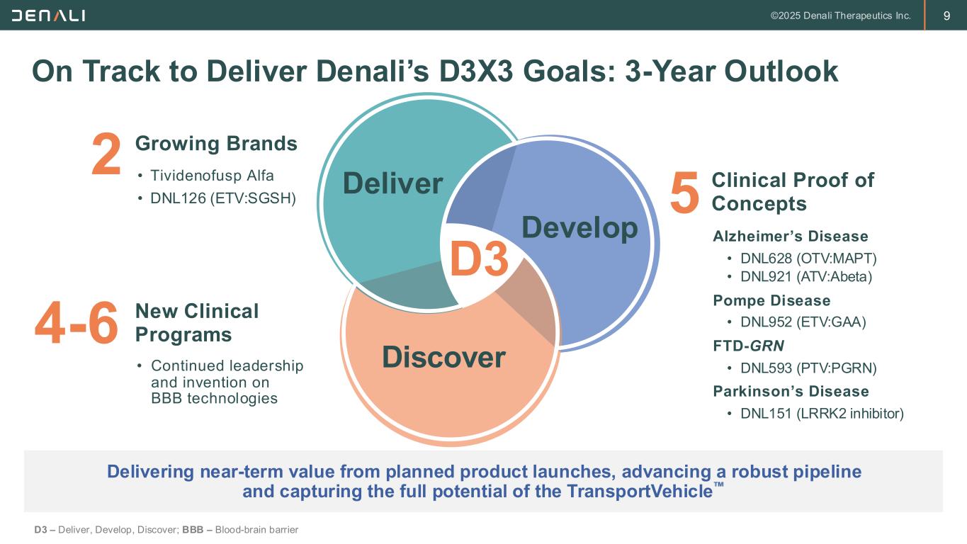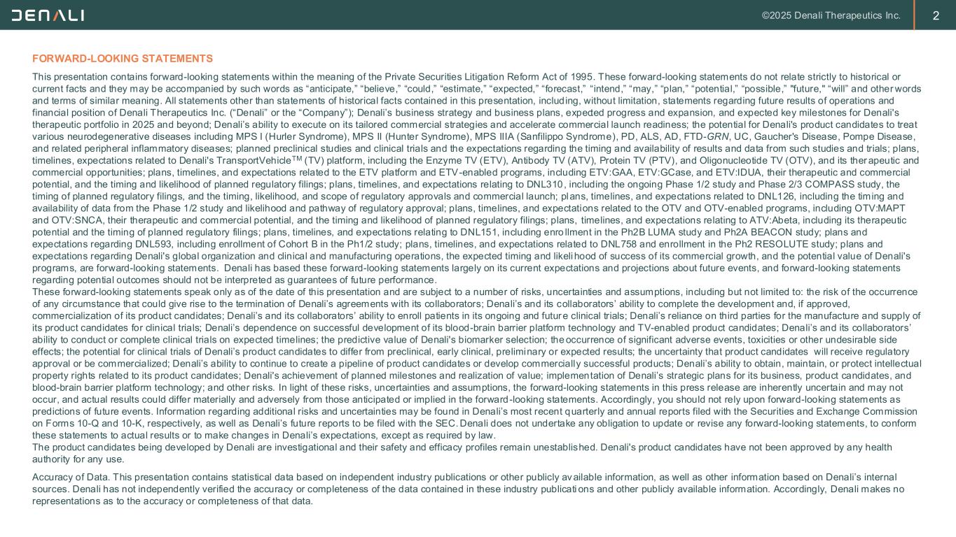 2 FORWARD-LOOKING STATEMENTS This presentation contains forward-looking statements within the meaning of the Private Securities Litigation Reform Act of 1995. These forward-looking statements do not relate strictly to historical or current facts and they may be accompanied by such words as “anticipate,” “believe,” “could,” “estimate,” “expected,” “forecast,” “intend,” “may,” “plan,” “potential,” “possible,” "future," “will” and other words and terms of similar meaning. All statements other than statements of historical facts contained in this presentation, including, without limitation, statements regarding future results of operations and financial position of Denali Therapeutics Inc. (“Denali” or the “Company”); Denali’s business strategy and business plans, expected progress and expansion, and expected key milestones for Denali's therapeutic portfolio in 2025 and beyond; Denali’s ability to execute on its tailored commercial strategies and accelerate commercial launch readiness; the potential for Denali's product candidates to treat various neurodegenerative diseases including MPS I (Hurler Syndrome), MPS II (Hunter Syndrome), MPS IIIA (Sanfilippo Syndrome), PD, ALS, AD, FTD-GRN, UC, Gaucher's Disease, Pompe Disease, and related peripheral inflammatory diseases; planned preclinical studies and clinical trials and the expectations regarding the timing and availability of results and data from such studies and trials; plans, timelines, expectations related to Denali's TransportVehicleTM (TV) platform, including the Enzyme TV (ETV), Antibody TV (ATV), Protein TV (PTV), and Oligonucleotide TV (OTV), and its ther apeutic and commercial opportunities; plans, timelines, and expectations related to the ETV platform and ETV-enabled programs, including ETV:GAA, ETV:GCase, and ETV:IDUA, their therapeutic and commercial potential, and the timing and likelihood of planned regulatory filings; plans, timelines, and expectations relating to DNL310, including the ongoing Phase 1/2 study and Phase 2/3 COMPASS study, the timing of planned regulatory filings, and the timing, likelihood, and scope of regulatory approvals and commercial launch; plans, timelines, and expectations related to DNL126, including the timing and availability of data from the Phase 1/2 study and likelihood and pathway of regulatory approval; plans, timelines, and expectations related to the OTV and OTV-enabled programs, including OTV:MAPT and OTV:SNCA, their therapeutic and commercial potential, and the timing and likelihood of planned regulatory filings; plans, timelines, and expectations relating to ATV:Abeta, including its therapeutic potential and the timing of planned regulatory filings; plans, timelines, and expectations relating to DNL151, including enro llment in the Ph2B LUMA study and Ph2A BEACON study; plans and expectations regarding DNL593, including enrollment of Cohort B in the Ph1/2 study; plans, timelines, and expectations related to DNL758 and enrollment in the Ph2 RESOLUTE study; plans and expectations regarding Denali's global organization and clinical and manufacturing operations, the expected timing and likeli hood of success of its commercial growth, and the potential value of Denali's programs, are forward-looking statements. Denali has based these forward-looking statements largely on its current expectations and projections about future events, and forward-looking statements regarding potential outcomes should not be interpreted as guarantees of future performance. These forward-looking statements speak only as of the date of this presentation and are subject to a number of risks, uncertainties and assumptions, including but not limited to: the risk of the occurrence of any circumstance that could give rise to the termination of Denali’s agreements with its collaborators; Denali’s and its collaborators’ ability to complete the development and, if approved, commercialization of its product candidates; Denali’s and its collaborators’ ability to enroll patients in its ongoing and future clinical trials; Denali’s reliance on third parties for the manufacture and supply of its product candidates for clinical trials; Denali’s dependence on successful development of its blood-brain barrier platform technology and TV-enabled product candidates; Denali’s and its collaborators’ ability to conduct or complete clinical trials on expected timelines; the predictive value of Denali's biomarker selection; the occurrence of significant adverse events, toxicities or other undesirable side effects; the potential for clinical trials of Denali’s product candidates to differ from preclinical, early clinical, preliminary or expected results; the uncertainty that product candidates will receive regulatory approval or be commercialized; Denali’s ability to continue to create a pipeline of product candidates or develop commercially successful products; Denali’s ability to obtain, maintain, or protect intellectual property rights related to its product candidates; Denali's achievement of planned milestones and realization of value; implemen tation of Denali’s strategic plans for its business, product candidates, and blood-brain barrier platform technology; and other risks. In light of these risks, uncertainties and assumptions, the forward-looking statements in this press release are inherently uncertain and may not occur, and actual results could differ materially and adversely from those anticipated or implied in the forward-looking statements. Accordingly, you should not rely upon forward-looking statements as predictions of future events. Information regarding additional risks and uncertainties may be found in Denali’s most recent quarterly and annual reports filed with the Securities and Exchange Commission on Forms 10-Q and 10-K, respectively, as well as Denali’s future reports to be filed with the SEC. Denali does not undertake any obli
