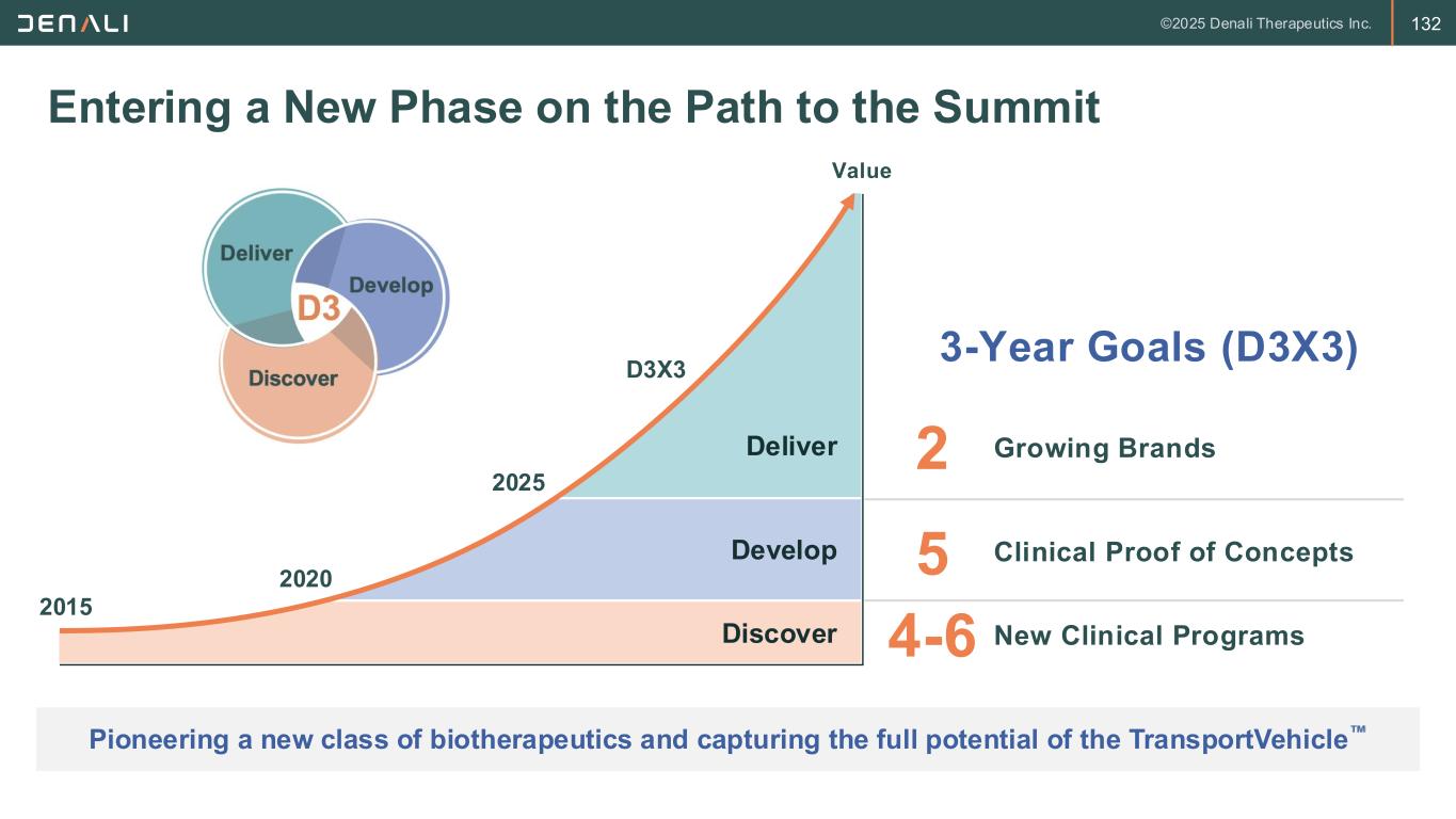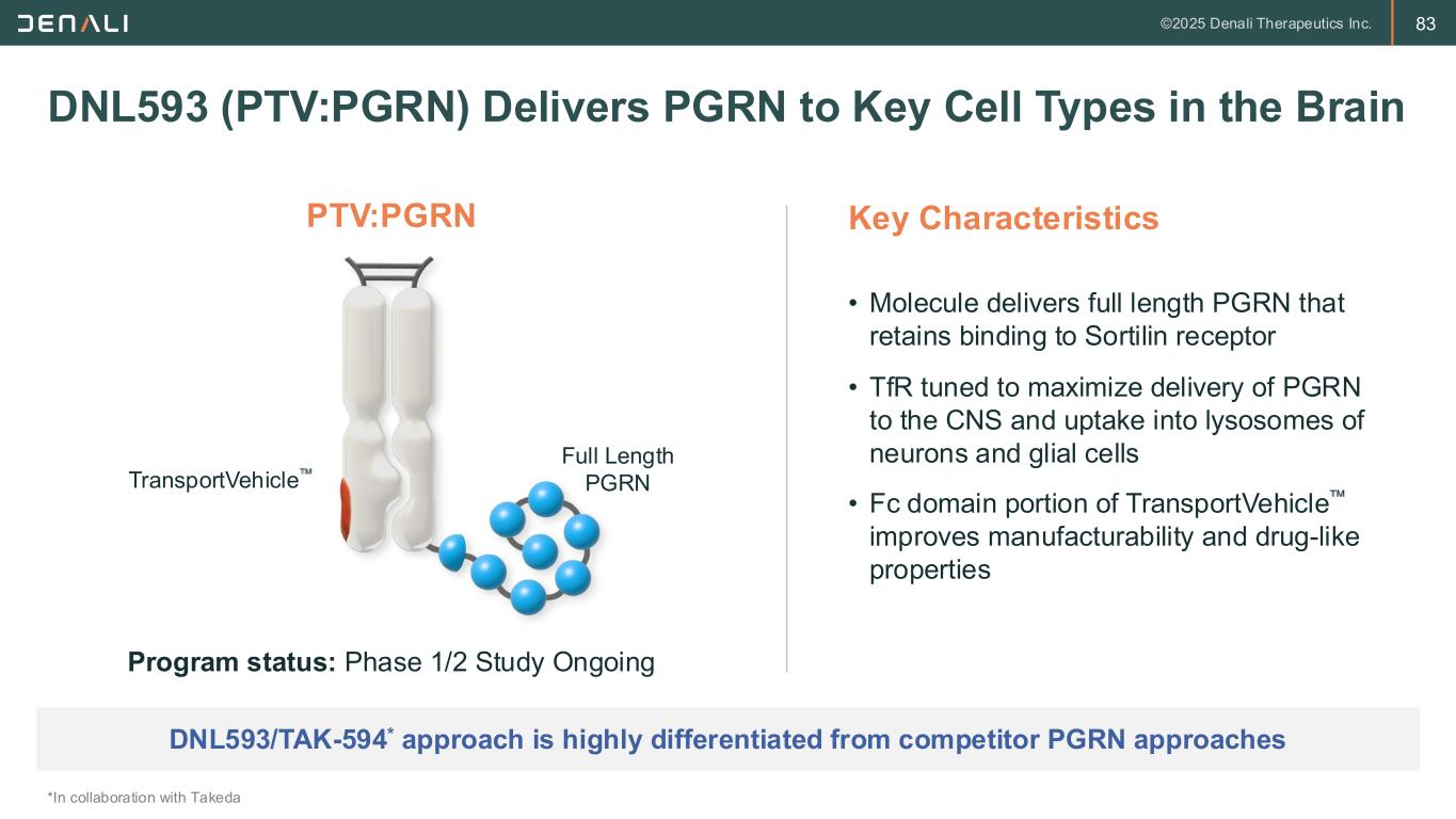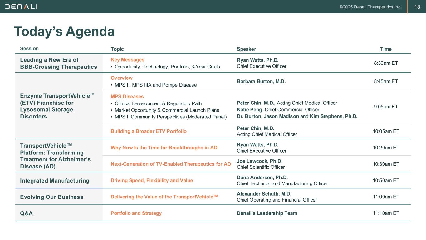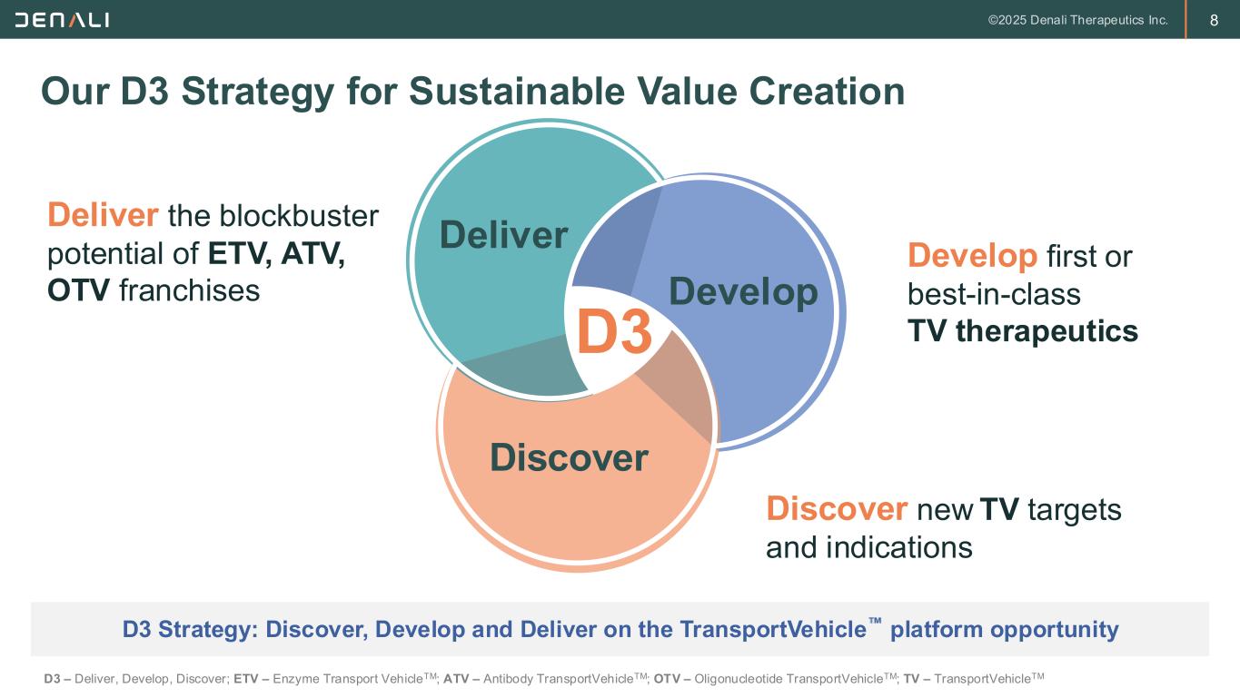 2 FORWARD-LOOKING STATEMENTS This presentation contains forward-looking statements within the meaning of the Private Securities Litigation Reform Act of 1995. These forward-looking statements do not relate strictly to historical or current facts and they may be accompanied by such words as “anticipate,” “believe,” “could,” “estimate,” “expected,” “forecast,” “intend,” “may,” “plan,” “potential,” “possible,” "future," “will” and other words and terms of similar meaning. All statements other than statements of historical facts contained in this presentation, including, without limitation, statements regarding future results of operations and financial position of Denali Therapeutics Inc. (“Denali” or the “Company”); Denali’s business strategy and business plans, expected progress and expansion, and expected key milestones for Denali's therapeutic portfolio in 2025 and beyond; Denali’s ability to execute on its tailored commercial strategies and accelerate commercial launch readiness; the potential for Denali's product candidates to treat various neurodegenerative diseases including MPS I (Hurler Syndrome), MPS II (Hunter Syndrome), MPS IIIA (Sanfilippo Syndrome), PD, ALS, AD, FTD-GRN, UC, Gaucher's Disease, Pompe Disease, and related peripheral inflammatory diseases; planned preclinical studies and clinical trials and the expectations regarding the timing and availability of results and data from such studies and trials; plans, timelines, expectations related to Denali's TransportVehicleTM (TV) platform, including the Enzyme TV (ETV), Antibody TV (ATV), Protein TV (PTV), and Oligonucleotide TV (OTV), and its ther apeutic and commercial opportunities; plans, timelines, and expectations related to the ETV platform and ETV-enabled programs, including ETV:GAA, ETV:GCase, and ETV:IDUA, their therapeutic and commercial potential, and the timing and likelihood of planned regulatory filings; plans, timelines, and expectations relating to DNL310, including the ongoing Phase 1/2 study and Phase 2/3 COMPASS study, the timing of planned regulatory filings, and the timing, likelihood, and scope of regulatory approvals and commercial launch; plans, timelines, and expectations related to DNL126, including the timing and availability of data from the Phase 1/2 study and likelihood and pathway of regulatory approval; plans, timelines, and expectations related to the OTV and OTV-enabled programs, including OTV:MAPT and OTV:SNCA, their therapeutic and commercial potential, and the timing and likelihood of planned regulatory filings; plans, timelines, and expectations relating to ATV:Abeta, including its therapeutic potential and the timing of planned regulatory filings; plans, timelines, and expectations relating to DNL151, including enro llment in the Ph2B LUMA study and Ph2A BEACON study; plans and expectations regarding DNL593, including enrollment of Cohort B in the Ph1/2 study; plans, timelines, and expectations related to DNL758 and enrollment in the Ph2 RESOLUTE study; plans and expectations regarding Denali's global organization and clinical and manufacturing operations, the expected timing and likeli hood of success of its commercial growth, and the potential value of Denali's programs, are forward-looking statements. Denali has based these forward-looking statements largely on its current expectations and projections about future events, and forward-looking statements regarding potential outcomes should not be interpreted as guarantees of future performance. These forward-looking statements speak only as of the date of this presentation and are subject to a number of risks, uncertainties and assumptions, including but not limited to: the risk of the occurrence of any circumstance that could give rise to the termination of Denali’s agreements with its collaborators; Denali’s and its collaborators’ ability to complete the development and, if approved, commercialization of its product candidates; Denali’s and its collaborators’ ability to enroll patients in its ongoing and future clinical trials; Denali’s reliance on third parties for the manufacture and supply of its product candidates for clinical trials; Denali’s dependence on successful development of its blood-brain barrier platform technology and TV-enabled product candidates; Denali’s and its collaborators’ ability to conduct or complete clinical trials on expected timelines; the predictive value of Denali's biomarker selection; the occurrence of significant adverse events, toxicities or other undesirable side effects; the potential for clinical trials of Denali’s product candidates to differ from preclinical, early clinical, preliminary or expected results; the uncertainty that product candidates will receive regulatory approval or be commercialized; Denali’s ability to continue to create a pipeline of product candidates or develop commercially successful products; Denali’s ability to obtain, maintain, or protect intellectual property rights related to its product candidates; Denali's achievement of planned milestones and realization of value; implemen tation of Denali’s strategic plans for its business, product candidates, and blood-brain barrier platform technology; and other risks. In light of these risks, uncertainties and assumptions, the forward-looking statements in this press release are inherently uncertain and may not occur, and actual results could differ materially and adversely from those anticipated or implied in the forward-looking statements. Accordingly, you should not rely upon forward-looking statements as predictions of future events. Information regarding additional risks and uncertainties may be found in Denali’s most recent quarterly and annual reports filed with the Securities and Exchange Commission on Forms 10-Q and 10-K, respectively, as well as Denali’s future reports to be filed with the SEC. Denali does not undertake any obli