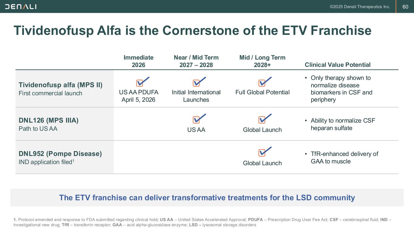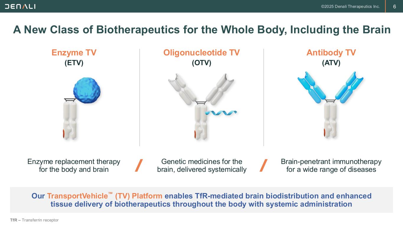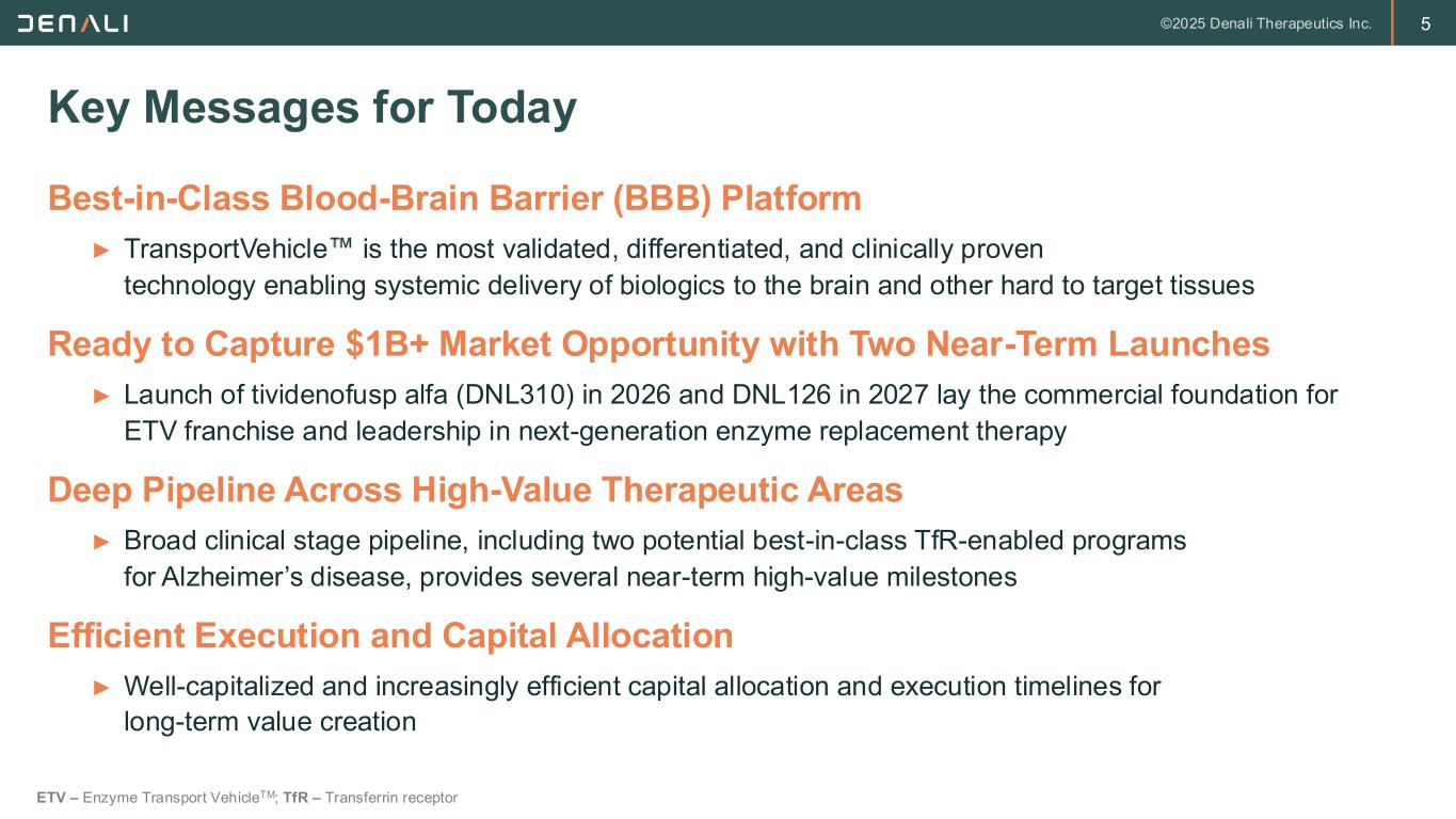 5 Key Messages for Today Best-in-Class Blood-Brain Barrier (BBB) Platform ► TransportVehicle is the most validated, differentiated, and clinically proven technology enabling systemic delivery of biologics to the brain and other hard to target tissues Ready to Capture $1B+ Market Opportunity with Two Near-Term Launches ► Launch of tividenofusp alfa (DNL310) in 2026 and DNL126 in 2027 lay the commercial foundation for ETV franchise and leadership in next-generation enzyme replacement therapy Deep Pipeline Across High-Value Therapeutic Areas ► Broad clinical stage pipeline, including two potential best-in-class TfR-enabled programs for Alzheimer’s disease, provides several near-term high-value milestones Efficient Execution and Capital Allocation ► Well-capitalized and increasingly efficient capital allocation and execution timelines for long-term value creation ETV – Enzyme Transport VehicleTM; TfR – Transferrin receptor