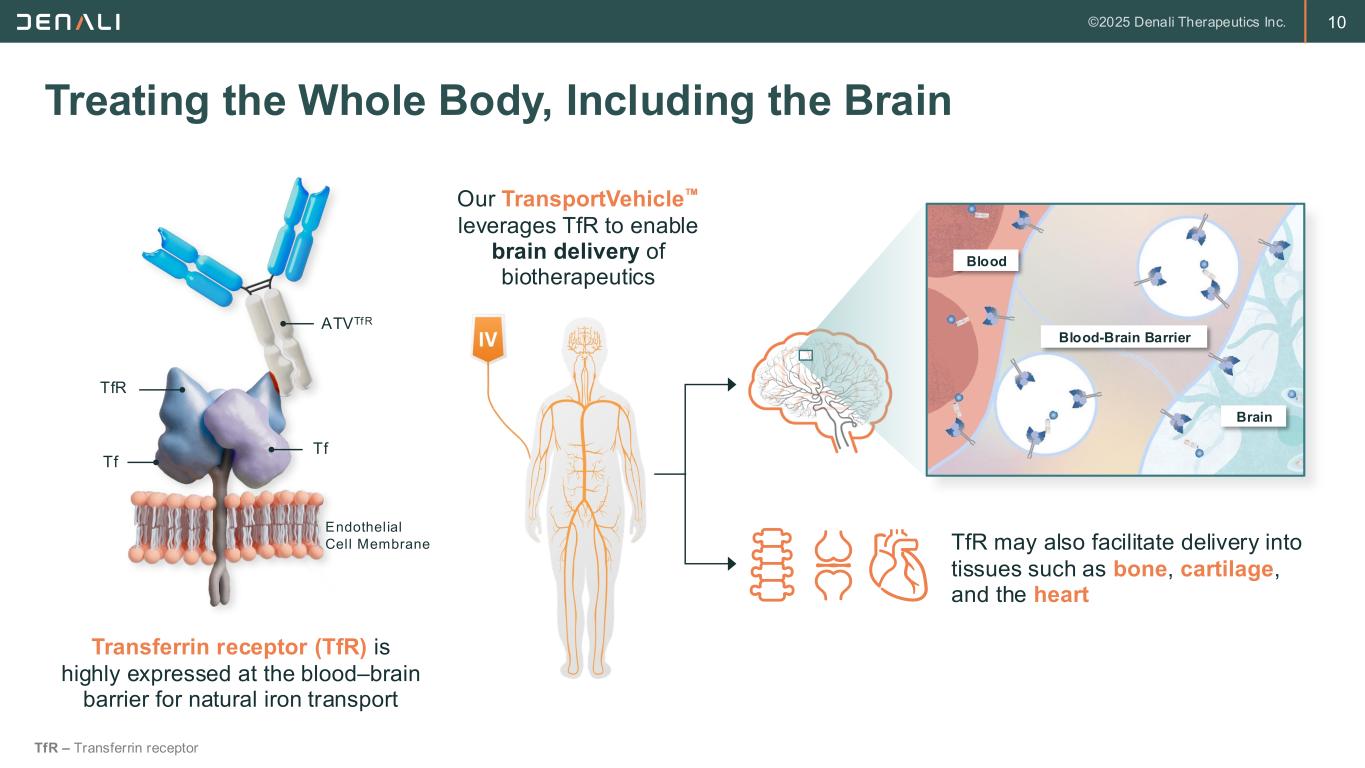 9 On Track to Deliver Denali’s D3X3 Goals: 3-Year Outlook Delivering near-term value from planned product launches, advancing a robust pipeline and capturing the full potential of the TransportVehicle 2 • Tividenofusp Alfa • DNL126 (ETV:SGSH) Clinical Proof of Concepts Alzheimer’s Disease • DNL628 (OTV:MAPT) • DNL921 (ATV:Abeta) Pompe Disease • DNL952 (ETV:GAA) FTD-GRN • DNL593 (PTV:PGRN) Parkinson’s Disease • DNL151 (LRRK2 inhibitor) 4-6 5 Growing Brands New Clinical Programs • Continued leadership and invention on BBB technologies Deliver Develop Discover D3 D3 – Deliver, Develop, Discover; BBB – Blood-brain barrier
