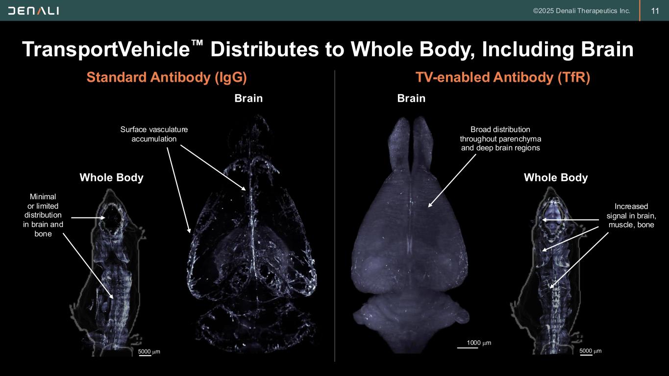 10 Treating the Whole Body, Including the Brain TfR may also facilitate delivery into tissues such as bone, cartilage, and the heart Transferrin receptor (TfR) is highly expressed at the blood–brain barrier for natural iron transport Our TransportVehicle leverages TfR to enable brain delivery of biotherapeutics Blood Brain Blood-Brain Barrier TfR ATVTfR Tf Tf Endothelial Cell Membrane TfR – Transferrin receptor