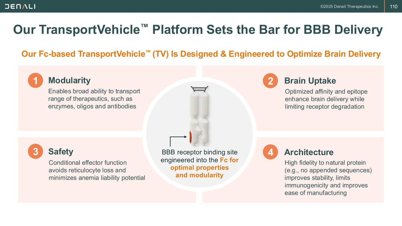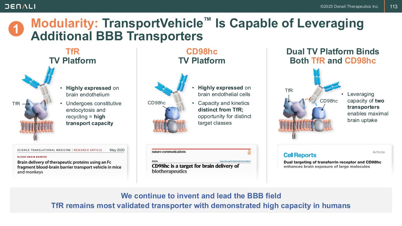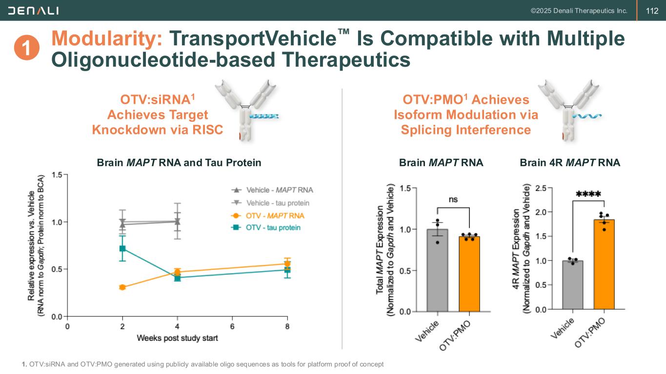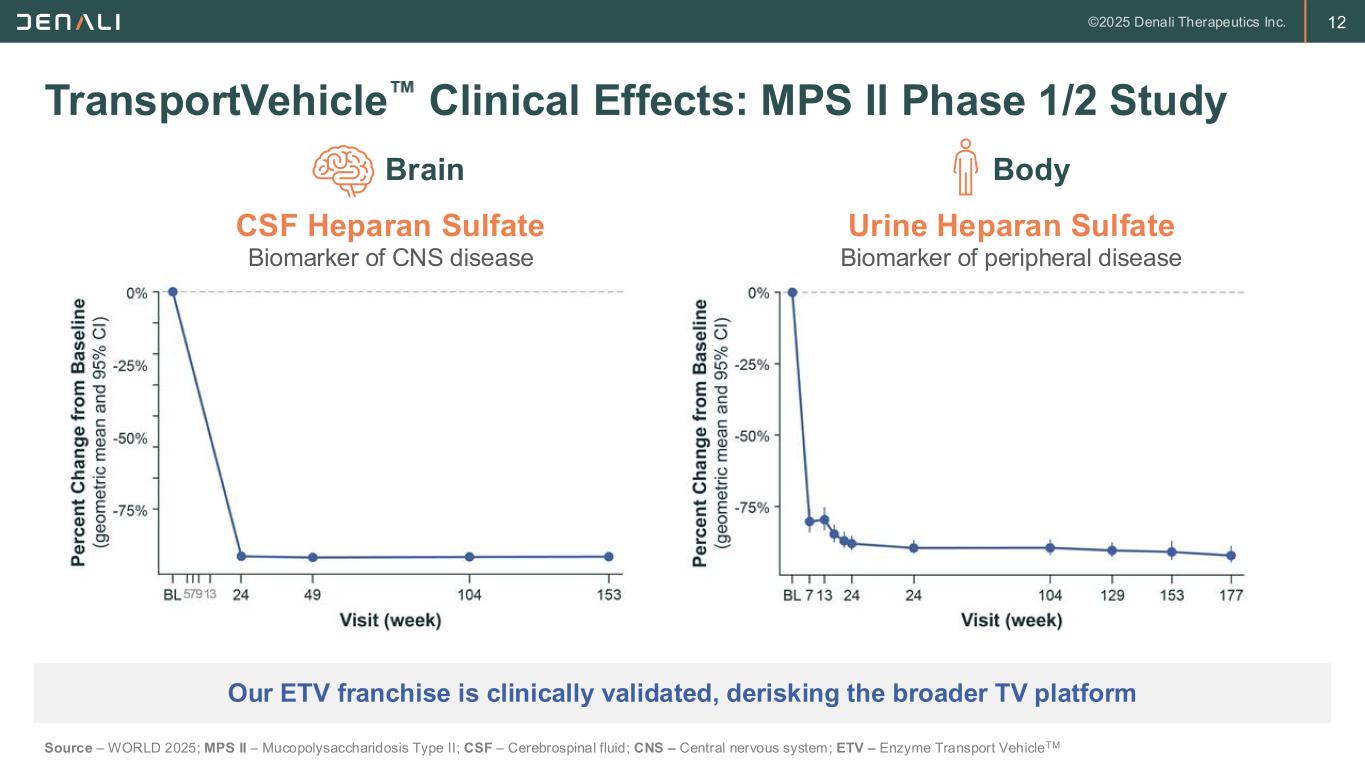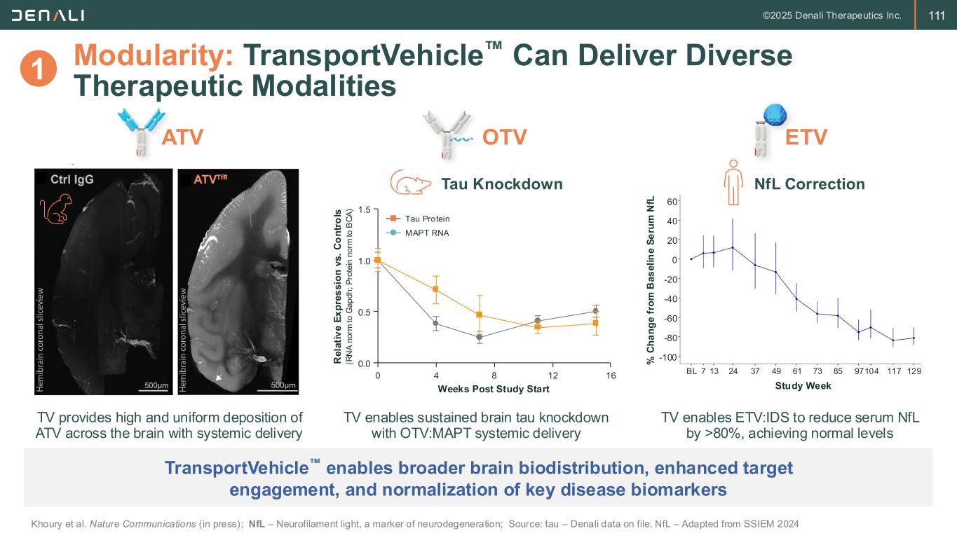 111 Study Week % C h a n g e f ro m B a s e li n e S e ru m N fL 60 40 20 0 -20 -40 -60 -80 -100 BL 7 13 24 37 49 61 73 85 97104 117 129 Modularity: TransportVehicle Can Deliver Diverse Therapeutic Modalities Khoury et al. Nature Communications (in press); NfL – Neurofilament light, a marker of neurodegeneration; Source: tau – Denali data on file, NfL – Adapted from SSIEM 2024 TransportVehicle enables broader brain biodistribution, enhanced target engagement, and normalization of key disease biomarkers ATV ETV TV enables ETV:IDS to reduce serum NfL by >80%, achieving normal levels TV provides high and uniform deposition of ATV across the brain with systemic delivery OTV TV enables sustained brain tau knockdown with OTV:MAPT systemic delivery Tau Knockdown NfL Correction 1.5 1.0 0.5 0.0 0 4 8 12 16 R e la ti v e E x p re s s io n v s . C o n tr o ls (R N A n o rm t o G a p d h ; P ro te in n o rm t o B C A ) Weeks Post Study Start Tau Protein MAPT RNA 1