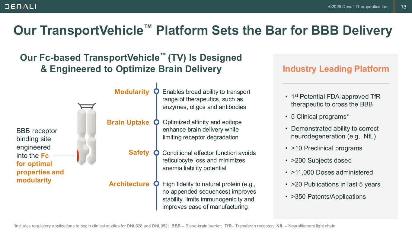 12 TransportVehicle Clinical Effects: MPS II Phase 1/2 Study Source – WORLD 2025; MPS II – Mucopolysaccharidosis Type II; CSF – Cerebrospinal fluid; CNS – Central nervous system; ETV – Enzyme Transport VehicleTM Our ETV franchise is clinically validated, derisking the broader TV platform Brain Body CSF Heparan Sulfate Biomarker of CNS disease Urine Heparan Sulfate Biomarker of peripheral disease