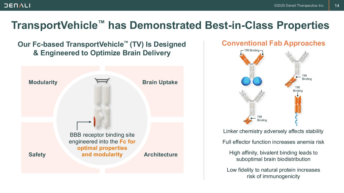 13 Our TransportVehicle Platform Sets the Bar for BBB Delivery *includes regulatory applications to begin clinical studies for DNL628 and DNL952; BBB – Blood-brain barrier; TfR– Transferrin receptor; NfL – Neurofilament light chain BBB receptor binding site engineered into the Fc for optimal properties and modularity Brain Uptake Our Fc-based TransportVehicle (TV) Is Designed & Engineered to Optimize Brain Delivery Modularity Safety Architecture • 1st Potential FDA-approved TfR therapeutic to cross the BBB • 5 Clinical programs* • Demonstrated ability to correct neurodegeneration (e.g., NfL) • >10 Preclinical programs • >200 Subjects dosed • >11,000 Doses administered • >20 Publications in last 5 years • >350 Patents/Applications Industry Leading Platform Enables broad ability to transport range of therapeutics, such as enzymes, oligos and antibodies Optimized affinity and epitope enhance brain delivery while limiting receptor degradation Conditional effector function avoids reticulocyte loss and minimizes anemia liability potential High fidelity to natural protein (e.g., no appended sequences) improves stability, limits immunogenicity and improves ease of manufacturing