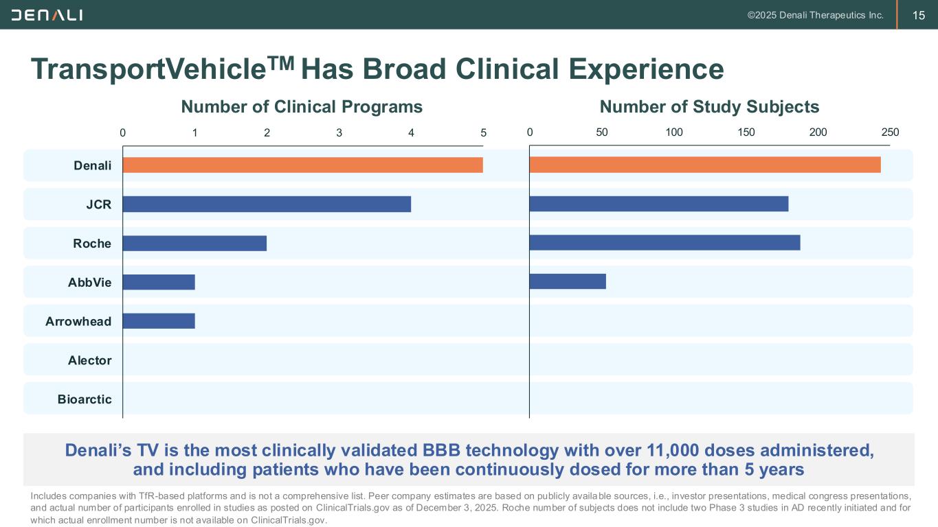 14 TransportVehicle has Demonstrated Best-in-Class Properties BBB receptor binding site engineered into the Fc for optimal properties and modularity Brain Uptake Our Fc-based TransportVehicle (TV) Is Designed & Engineered to Optimize Brain Delivery Modularity Safety Architecture Linker chemistry adversely affects stability Full effector function increases anemia risk High affinity, bivalent binding leads to suboptimal brain biodistribution Low fidelity to natural protein increases risk of immunogenicity Conventional Fab Approaches TfR Binding TfR Binding TfR Binding TfR Binding