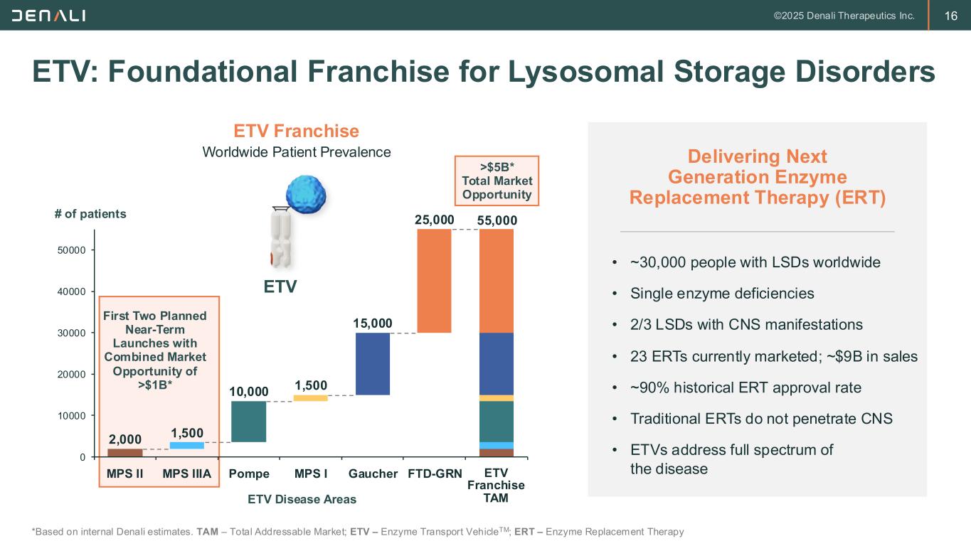 15 TransportVehicleTM Has Broad Clinical Experience Includes companies with TfR-based platforms and is not a comprehensive list. Peer company estimates are based on publicly available sources, i.e., investor presentations, medical congress presentations, and actual number of participants enrolled in studies as posted on ClinicalTrials.gov as of December 3, 2025. Roche number of subjects does not include two Phase 3 studies in AD recently initiated and for which actual enrollment number is not available on ClinicalTrials.gov. Denali’s TV is the most clinically validated BBB technology with over 11,000 doses administered, and including patients who have been continuously dosed for more than 5 years Number of Clinical Programs Number of Study Subjects 0 1 2 3 4 5 Denali JCR Roche AbbVie Arrowhead Alector Bioarctic 0 50 100 150 200 250