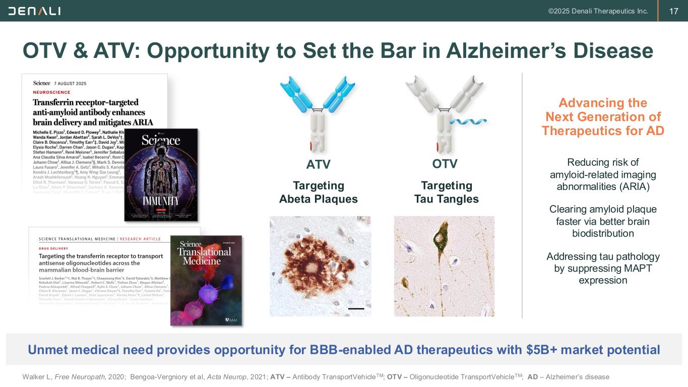16 ETV: Foundational Franchise for Lysosomal Storage Disorders *Based on internal Denali estimates. TAM – Total Addressable Market; ETV – Enzyme Transport VehicleTM; ERT – Enzyme Replacement Therapy • ~30,000 people with LSDs worldwide • Single enzyme deficiencies • 2/3 LSDs with CNS manifestations • 23 ERTs currently marketed; ~$9B in sales • ~90% historical ERT approval rate • Traditional ERTs do not penetrate CNS • ETVs address full spectrum of the disease ETV Franchise Worldwide Patient Prevalence 2,000 1,500 10,000 1,500 15,000 25,000 0 10000 20000 30000 40000 50000 MPS I GaucherMPS IIIA 55,000 Pompe FTD-GRNMPS II First Two Planned Near-Term Launches with Combined Market Opportunity of >$1B* ETV Franchise TAM Delivering Next Generation Enzyme Replacement Therapy (ERT) >$5B* Total Market Opportunity # of patients ETV Disease Areas ETV