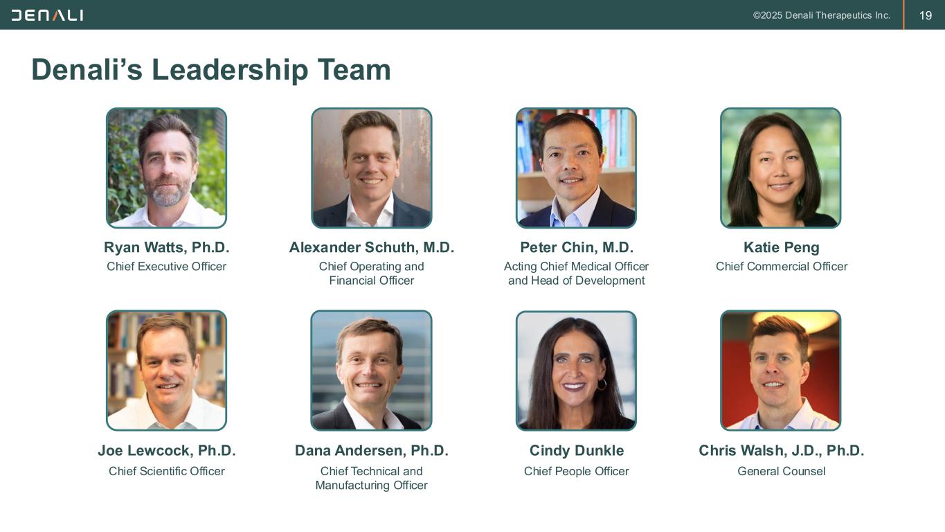 18 Today’s Agenda Session Topic Speaker Time Leading a New Era of BBB-Crossing Therapeutics Key Messages • Opportunity, Technology, Portfolio, 3-Year Goals Ryan Watts, Ph.D. Chief Executive Officer 8:30am ET Enzyme TransportVehicle (ETV) Franchise for Lysosomal Storage Disorders Overview • MPS II, MPS IIIA and Pompe Disease Barbara Burton, M.D. 8:45am ET MPS Diseases • Clinical Development & Regulatory Path • Market Opportunity & Commercial Launch Plans • MPS II Community Perspectives (Moderated Panel) Peter Chin, M.D., Acting Chief Medical Officer Katie Peng, Chief Commercial Officer Dr. Burton, Jason Madison and Kim Stephens, Ph.D. 9:05am ET Building a Broader ETV Portfolio Peter Chin, M.D. Acting Chief Medical Officer 10:05am ET TransportVehicle Platform: Transforming Treatment for Alzheimer’s Disease (AD) Why Now Is the Time for Breakthroughs in AD Ryan Watts, Ph.D. Chief Executive Officer 10:20am ET Next-Generation of TV-Enabled Therapeutics for AD Joe Lewcock, Ph.D. Chief Scientific Officer 10:30am ET Integrated Manufacturing Driving Speed, Flexibility and Value Dana Andersen, Ph.D. Chief Technical and Manufacturing Officer 10:50am ET Evolving Our Business Delivering the Value of the TransportVehicleTM Alexander Schuth, M.D. Chief Operating and Financial Officer 11:00am ET Q&A Portfolio and Strategy Denali’s Leadership Team 11:10am ET