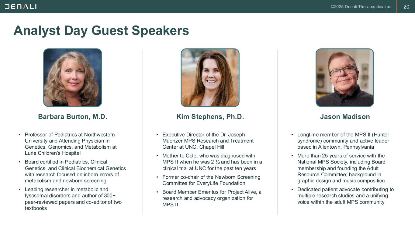 19 Denali’s Leadership Team Ryan Watts, Ph.D. Joe Lewcock, Ph.D. Alexander Schuth, M.D. Dana Andersen, Ph.D. Peter Chin, M.D. Cindy Dunkle Katie Peng Chris Walsh, J.D., Ph.D. Chief Executive Officer Chief Scientific Officer Chief Operating and Financial Officer Chief Technical and Manufacturing Officer Acting Chief Medical Officer and Head of Development Chief People Officer Chief Commercial Officer General Counsel