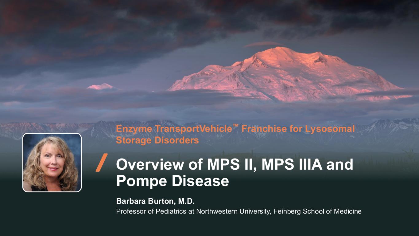 21 Enzyme TransportVehicle Franchise for Lysosomal Storage Disorders Overview of MPS II, MPS IIIA and Pompe Disease Barbara Burton, M.D. Professor of Pediatrics at Northwestern University, Feinberg School of Medicine