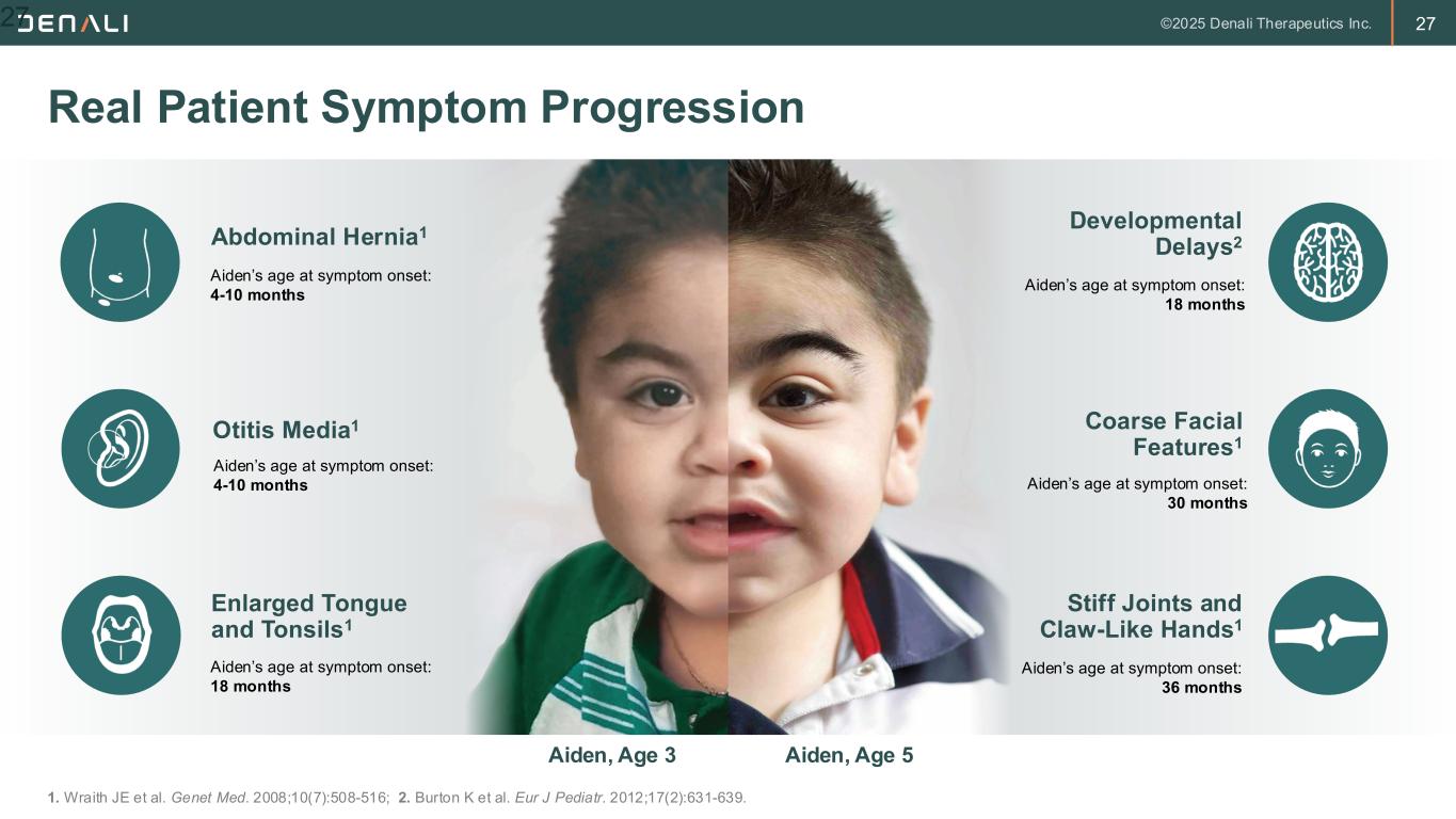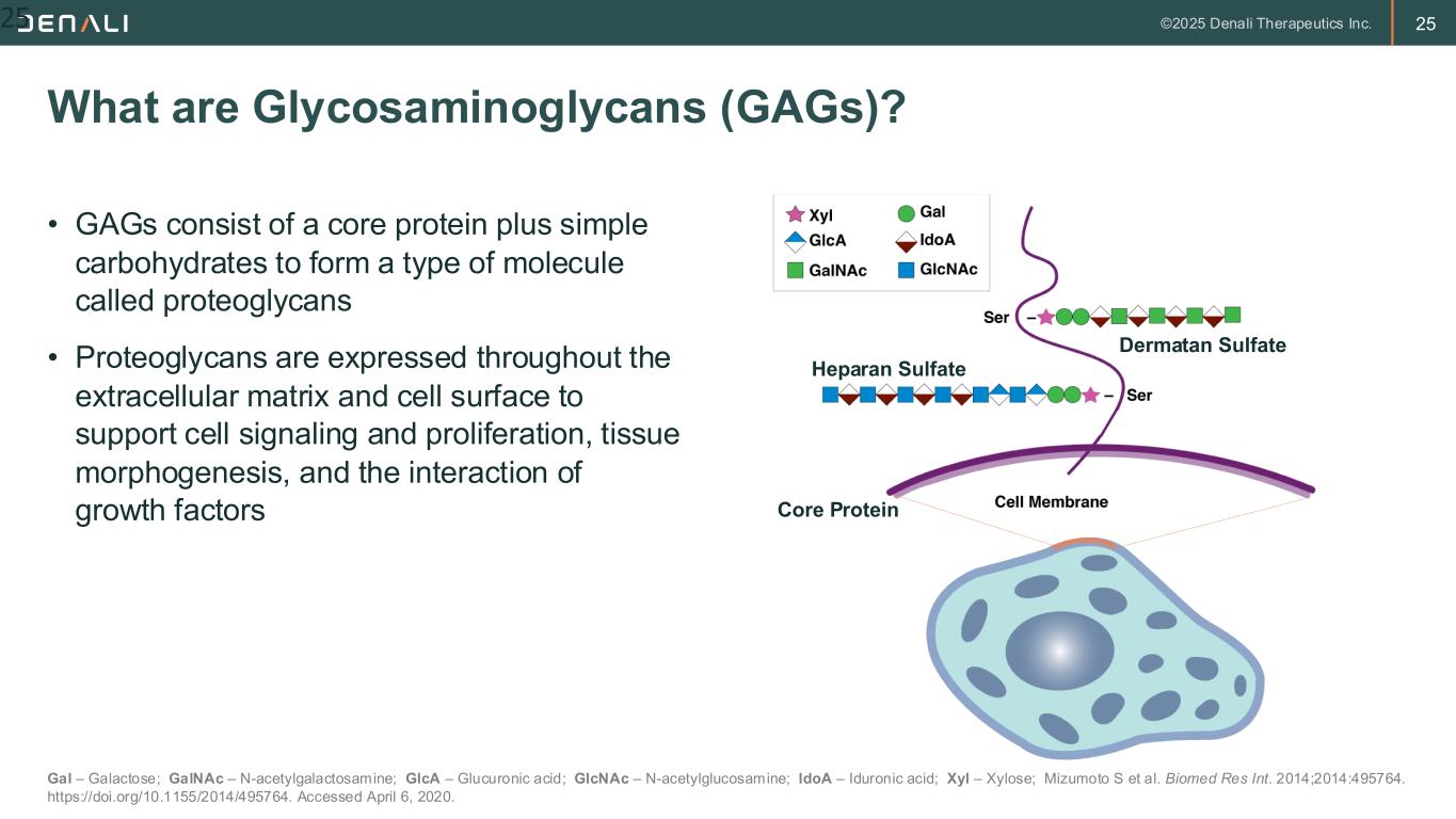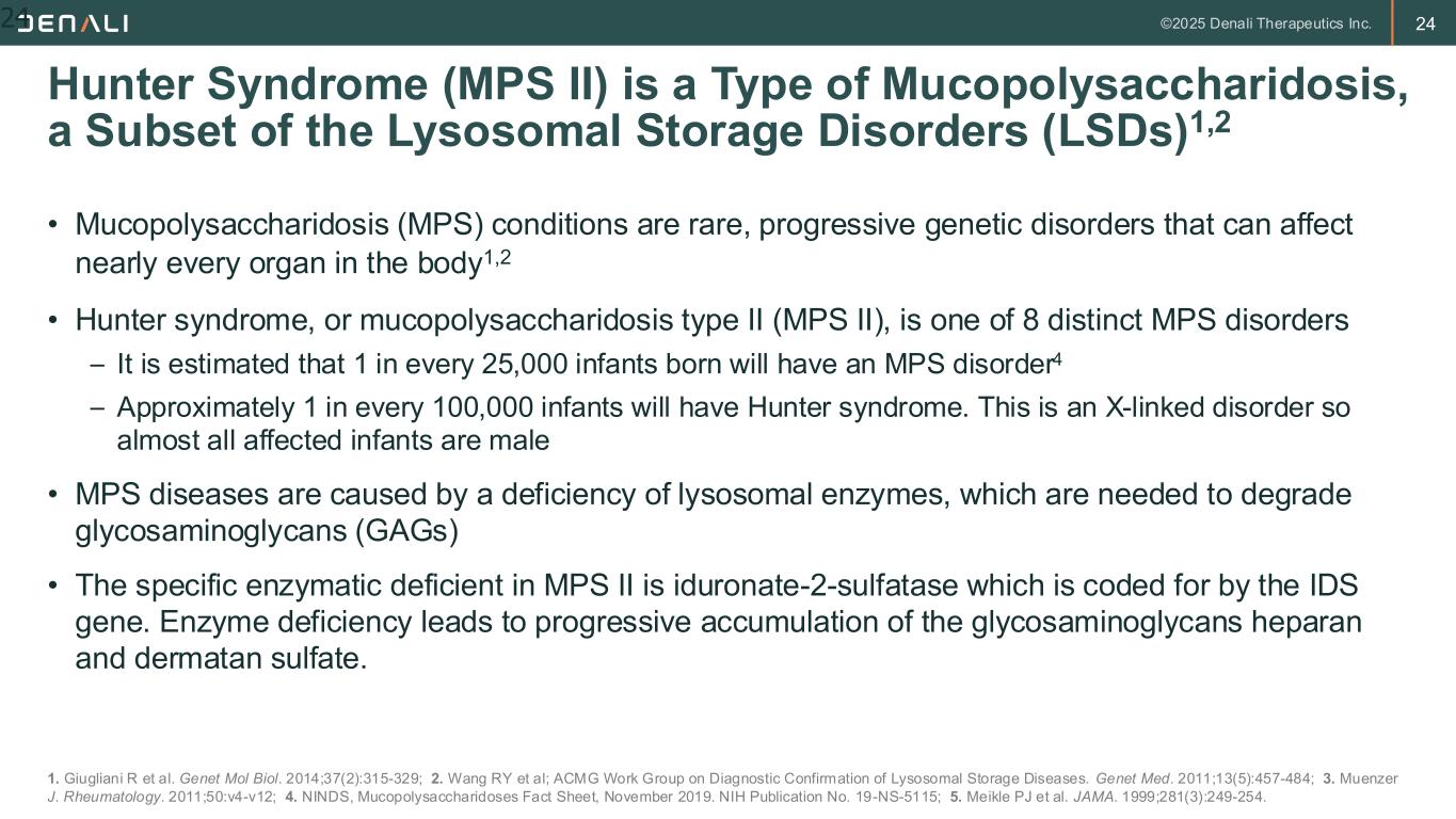 24 • Mucopolysaccharidosis (MPS) conditions are rare, progressive genetic disorders that can affect nearly every organ in the body1,2 • Hunter syndrome, or mucopolysaccharidosis type II (MPS II), is one of 8 distinct MPS disorders – It is estimated that 1 in every 25,000 infants born will have an MPS disorder4 – Approximately 1 in every 100,000 infants will have Hunter syndrome. This is an X-linked disorder so almost all affected infants are male • MPS diseases are caused by a deficiency of lysosomal enzymes, which are needed to degrade glycosaminoglycans (GAGs) • The specific enzymatic deficient in MPS II is iduronate-2-sulfatase which is coded for by the IDS gene. Enzyme deficiency leads to progressive accumulation of the glycosaminoglycans heparan and dermatan sulfate. Hunter Syndrome (MPS II) is a Type of Mucopolysaccharidosis, a Subset of the Lysosomal Storage Disorders (LSDs)1,2 1. Giugliani R et al. Genet Mol Biol. 2014;37(2):315-329; 2. Wang RY et al; ACMG Work Group on Diagnostic Confirmation of Lysosomal Storage Diseases. Genet Med. 2011;13(5):457-484; 3. Muenzer J. Rheumatology. 2011;50:v4-v12; 4. NINDS, Mucopolysaccharidoses Fact Sheet, November 2019. NIH Publication No. 19-NS-5115; 5. Meikle PJ et al. JAMA. 1999;281(3):249-254. 24