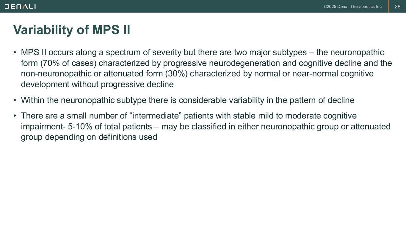 26 • MPS II occurs along a spectrum of severity but there are two major subtypes – the neuronopathic form (70% of cases) characterized by progressive neurodegeneration and cognitive decline and the non-neuronopathic or attenuated form (30%) characterized by normal or near-normal cognitive development without progressive decline • Within the neuronopathic subtype there is considerable variability in the pattern of decline • There are a small number of “intermediate” patients with stable mild to moderate cognitive impairment- 5-10% of total patients – may be classified in either neuronopathic group or attenuated group depending on definitions used Variability of MPS II