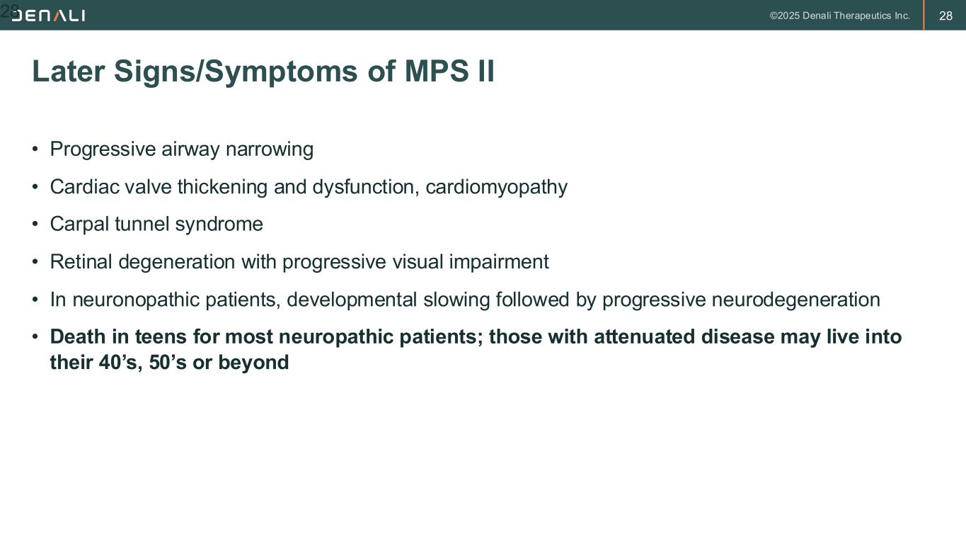 27 Real Patient Symptom Progression 1. Wraith JE et al. Genet Med. 2008;10(7):508-516; 2. Burton K et al. Eur J Pediatr. 2012;17(2):631-639. 27 Aiden, Age 3 Aiden, Age 5 Abdominal Hernia1 Otitis Media1 Enlarged Tongue and Tonsils1 Developmental Delays2 Coarse Facial Features1 Stiff Joints and Claw-Like Hands1 Aiden’s age at symptom onset: 4-10 months Aiden’s age at symptom onset: 4-10 months Aiden’s age at symptom onset: 18 months Aiden’s age at symptom onset: 30 months Aiden’s age at symptom onset: 36 months Aiden’s age at symptom onset: 18 months