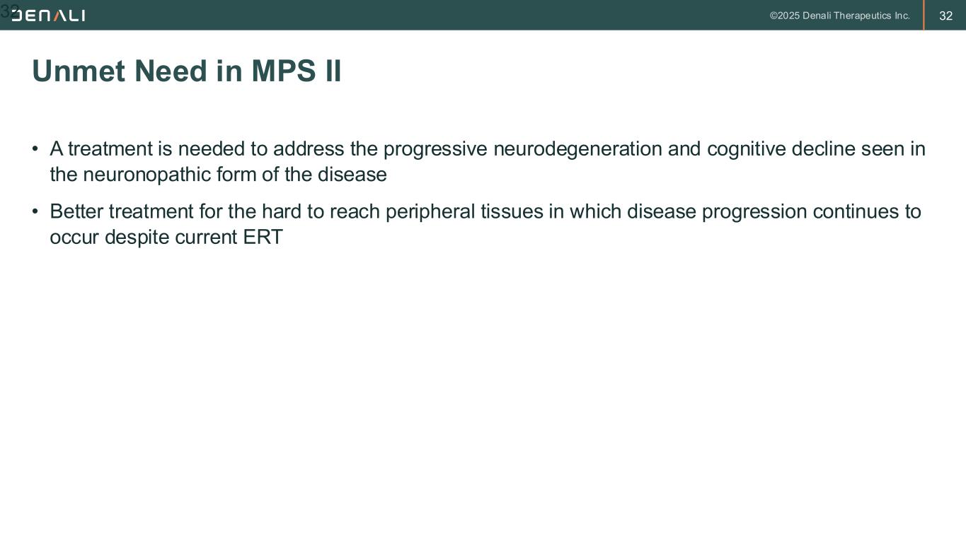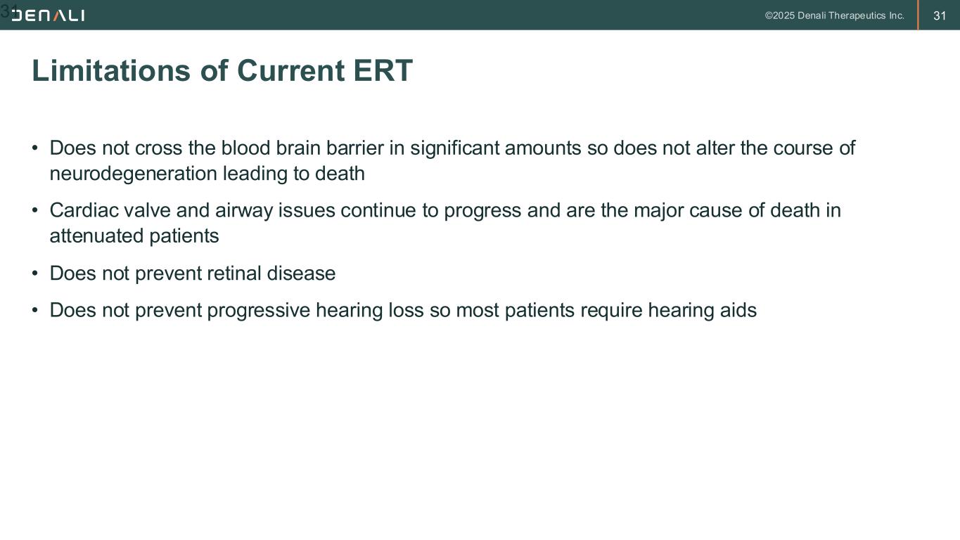 31 • Does not cross the blood brain barrier in significant amounts so does not alter the course of neurodegeneration leading to death • Cardiac valve and airway issues continue to progress and are the major cause of death in attenuated patients • Does not prevent retinal disease • Does not prevent progressive hearing loss so most patients require hearing aids Limitations of Current ERT 31