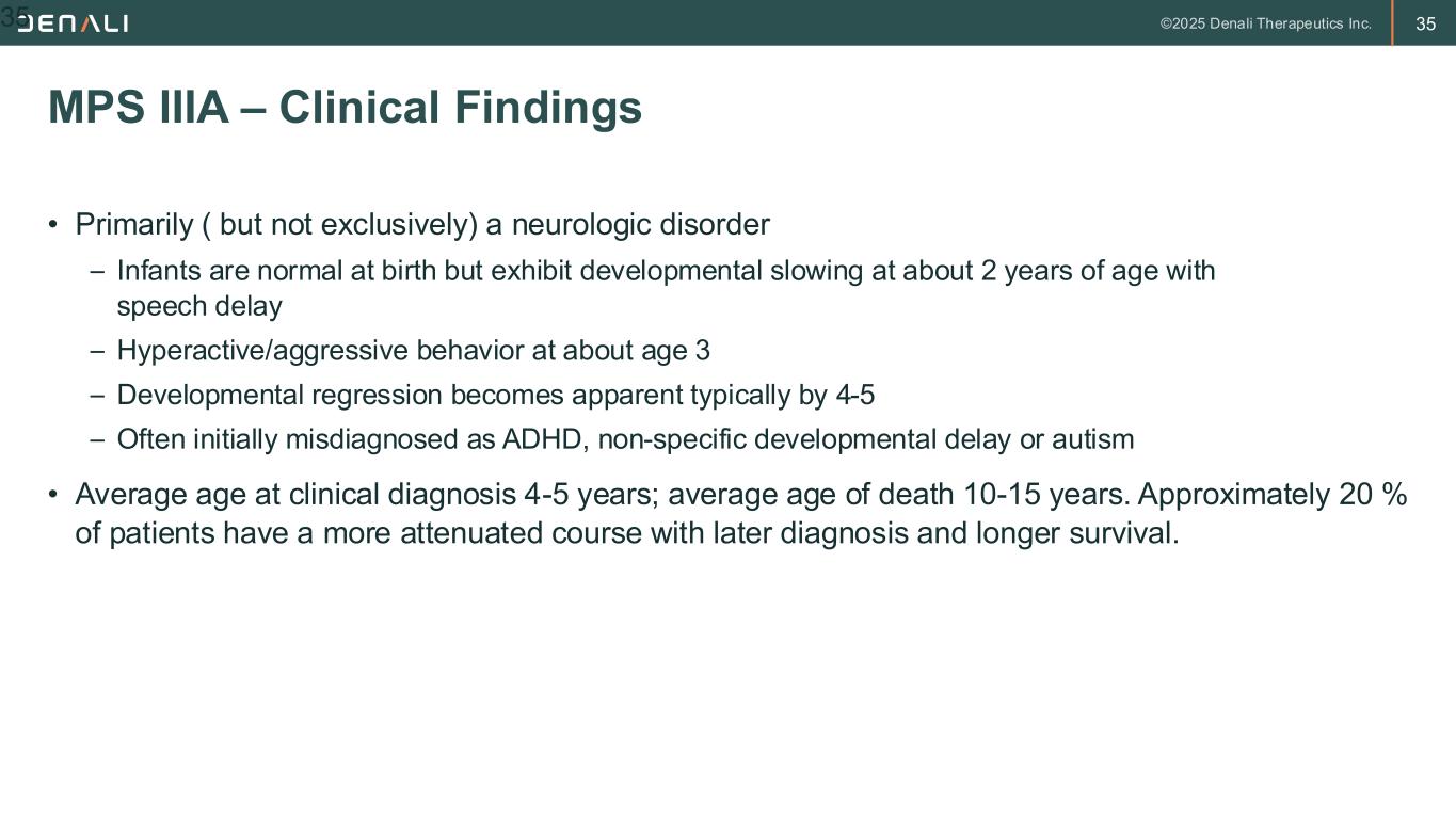 34 • Autosomal recessive disorder resulting from deficiency of the enzyme N-sulfoglucosamine sulfohydrolase (SGSH), also referred to as sulfamidase or heparan sulfate sulfatase. This leads to progressive accumulation of heparan sulfate. • Most common of the 4 types of MPS III, accounting for about 70% of cases • Overall incidence estimated at 1 in 125,000 births MPS IIIA – Sanfilippo Syndrome, Type A 34