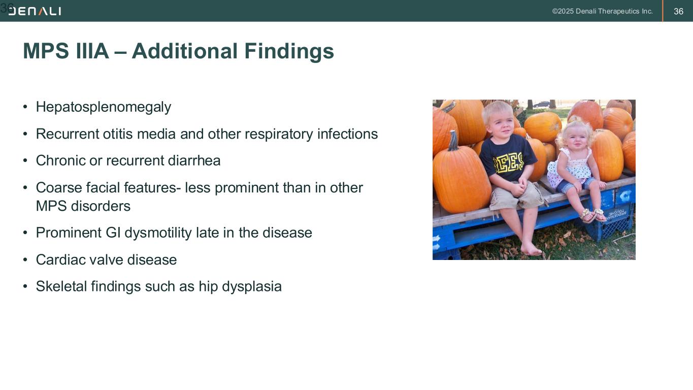 35 • Primarily ( but not exclusively) a neurologic disorder – Infants are normal at birth but exhibit developmental slowing at about 2 years of age with speech delay – Hyperactive/aggressive behavior at about age 3 – Developmental regression becomes apparent typically by 4-5 – Often initially misdiagnosed as ADHD, non-specific developmental delay or autism • Average age at clinical diagnosis 4-5 years; average age of death 10-15 years. Approximately 20 % of patients have a more attenuated course with later diagnosis and longer survival. MPS IIIA – Clinical Findings 35
