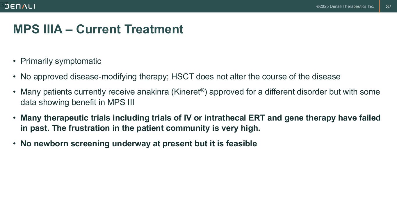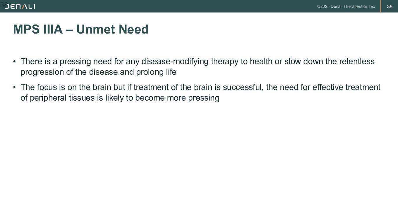 37 • Primarily symptomatic • No approved disease-modifying therapy; HSCT does not alter the course of the disease • Many patients currently receive anakinra (Kineret®) approved for a different disorder but with some data showing benefit in MPS III • Many therapeutic trials including trials of IV or intrathecal ERT and gene therapy have failed in past. The frustration in the patient community is very high. • No newborn screening underway at present but it is feasible MPS IIIA – Current Treatment 37