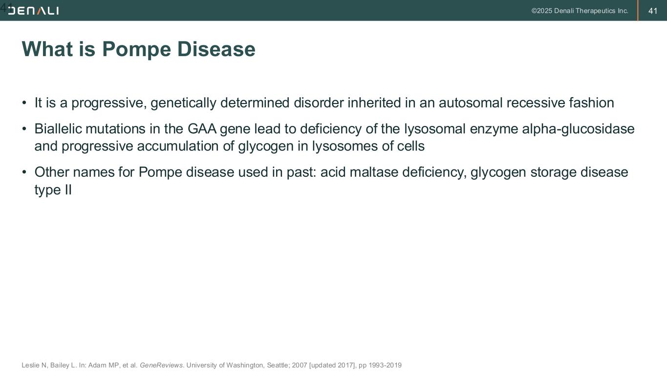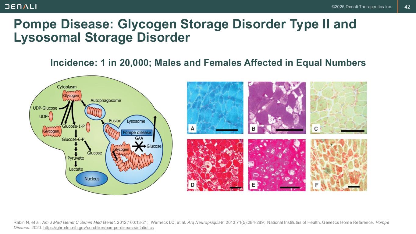 41 • It is a progressive, genetically determined disorder inherited in an autosomal recessive fashion • Biallelic mutations in the GAA gene lead to deficiency of the lysosomal enzyme alpha-glucosidase and progressive accumulation of glycogen in lysosomes of cells • Other names for Pompe disease used in past: acid maltase deficiency, glycogen storage disease type II What is Pompe Disease Leslie N, Bailey L. In: Adam MP, et al. GeneReviews. University of Washington, Seattle; 2007 [updated 2017], pp 1993-2019 41