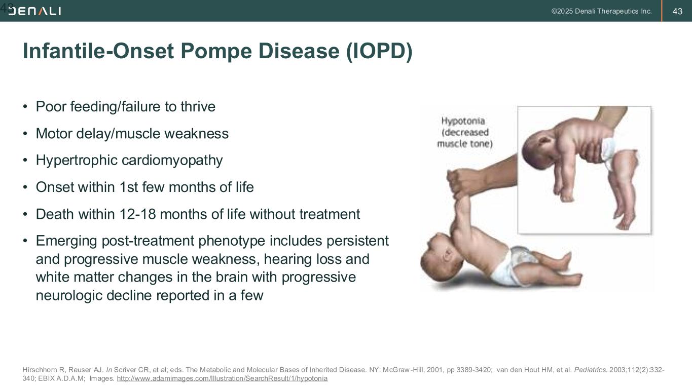 42 Pompe Disease: Glycogen Storage Disorder Type II and Lysosomal Storage Disorder Rabin N, et al. Am J Med Genet C Semin Med Genet. 2012;160:13-21; Werneck LC, et al. Arq Neuropsiquiatr. 2013;71(5):284-289; National Institutes of Health. Genetics Home Reference. Pompe Disease. 2020. https://ghr.nlm.nih.gov/condition/pompe-disease#statistics Incidence: 1 in 20,000; Males and Females Affected in Equal Numbers