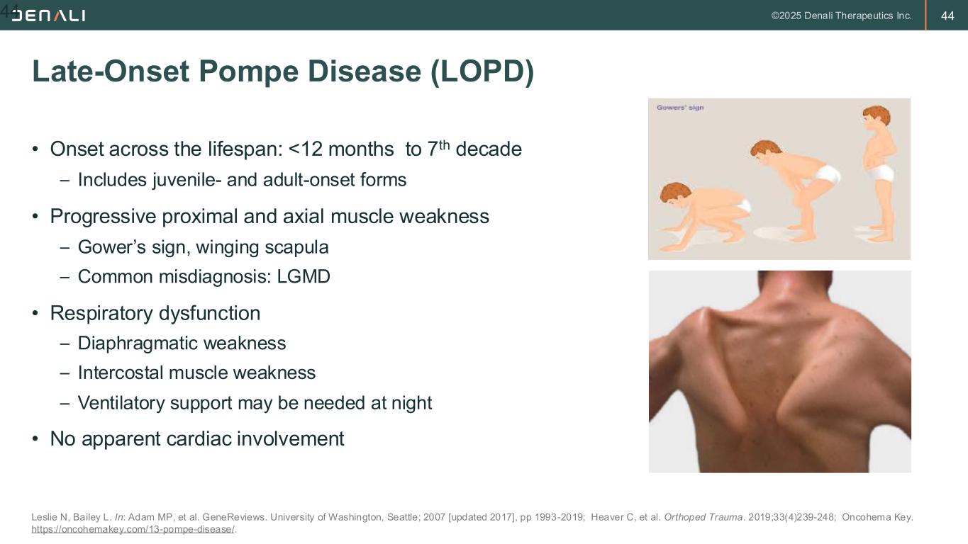 43 • Poor feeding/failure to thrive • Motor delay/muscle weakness • Hypertrophic cardiomyopathy • Onset within 1st few months of life • Death within 12-18 months of life without treatment • Emerging post-treatment phenotype includes persistent and progressive muscle weakness, hearing loss and white matter changes in the brain with progressive neurologic decline reported in a few Infantile-Onset Pompe Disease (IOPD) Hirschhorn R, Reuser AJ. In Scriver CR, et al; eds. The Metabolic and Molecular Bases of Inherited Disease. NY: McGraw -Hill, 2001, pp 3389-3420; van den Hout HM, et al. Pediatrics. 2003;112(2):332- 340; EBIX A.D.A.M; Images. http://www.adamimages.com/Illustration/SearchResult/1/hypotonia 43