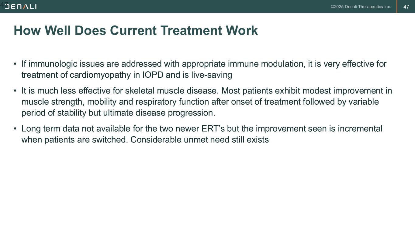46 • 3 approved forms of ERT available in US – Lumizyme – approved for both IOPD and LOPD – Nexviazyme – approved for LOPD in children and adults – Pombiliti – given with Opfolda (miglustat) approved for adults not improving on their current ERT • Patients with IOPD are treated urgently at time of diagnosis. Patients with LOPD diagnosed clinically are offered treatment at diagnosis; those diagnosed by NBS are monitored and treated once symptoms appear Current Treatment of Pompe Disease 46
