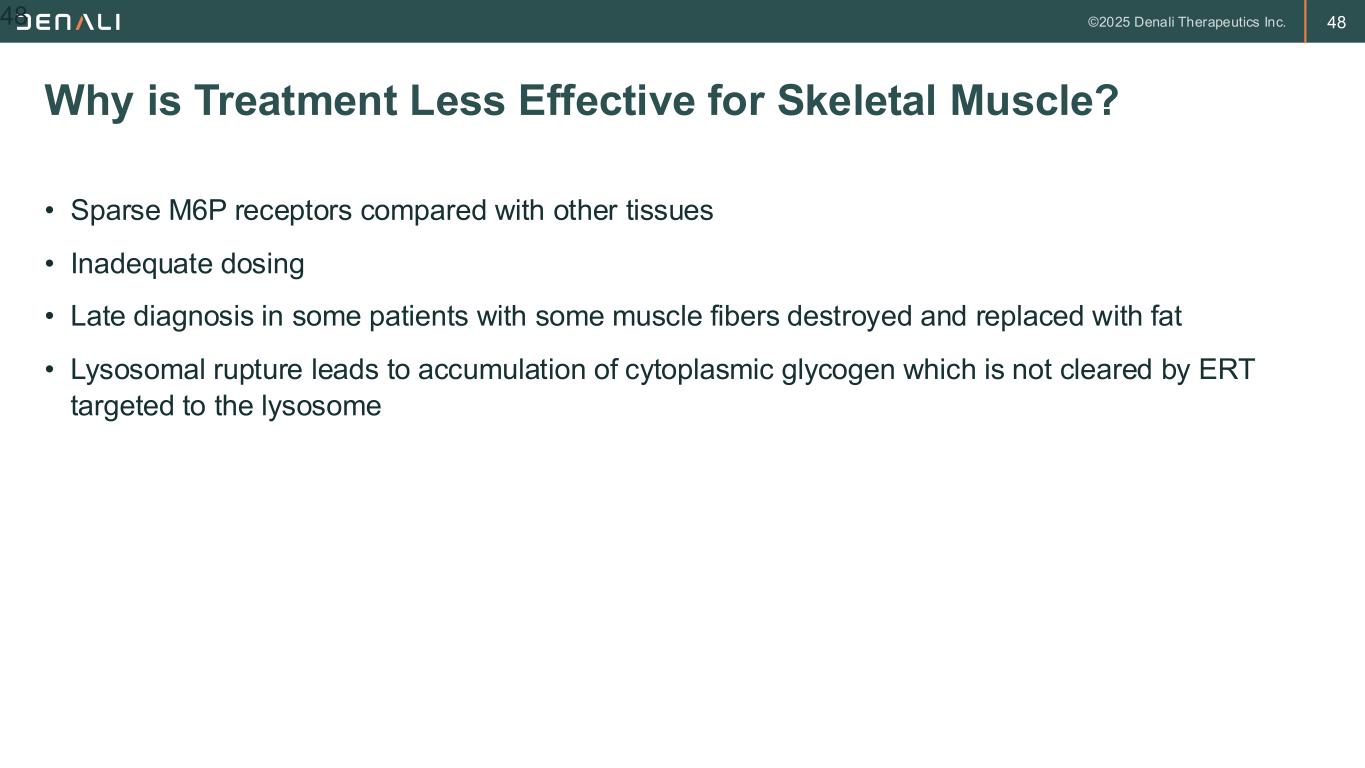 47 • If immunologic issues are addressed with appropriate immune modulation, it is very effective for treatment of cardiomyopathy in IOPD and is live-saving • It is much less effective for skeletal muscle disease. Most patients exhibit modest improvement in muscle strength, mobility and respiratory function after onset of treatment followed by variable period of stability but ultimate disease progression. • Long term data not available for the two newer ERT’s but the improvement seen is incremental when patients are switched. Considerable unmet need still exists How Well Does Current Treatment Work 47