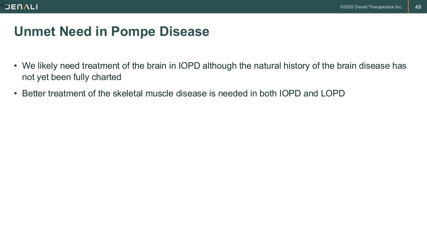 48 • Sparse M6P receptors compared with other tissues • Inadequate dosing • Late diagnosis in some patients with some muscle fibers destroyed and replaced with fat • Lysosomal rupture leads to accumulation of cytoplasmic glycogen which is not cleared by ERT targeted to the lysosome Why is Treatment Less Effective for Skeletal Muscle? 48