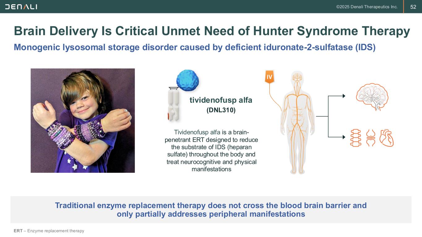 51 ETV Franchise Opportunity in Lysosomal Storage Disorders ETV – Enzyme transport vehicle; LSDs – Lysosomal storage disorders; CNS – Central nervous system; ERTs – Enzyme replacement therapies ~90% historical approval rate Goal is to treat the full disease spectrum ETVs enable brain delivery of enzymes to address cognitive and behavioral symptoms Potential to enhance peripheral delivery Targeting Brain & Body with ETVAddressing High Unmet Need • LSDs are single-enzyme deficiency diseases • 30,000 people with LSDs worldwide • 2/3 LSDs with CNS manifestations