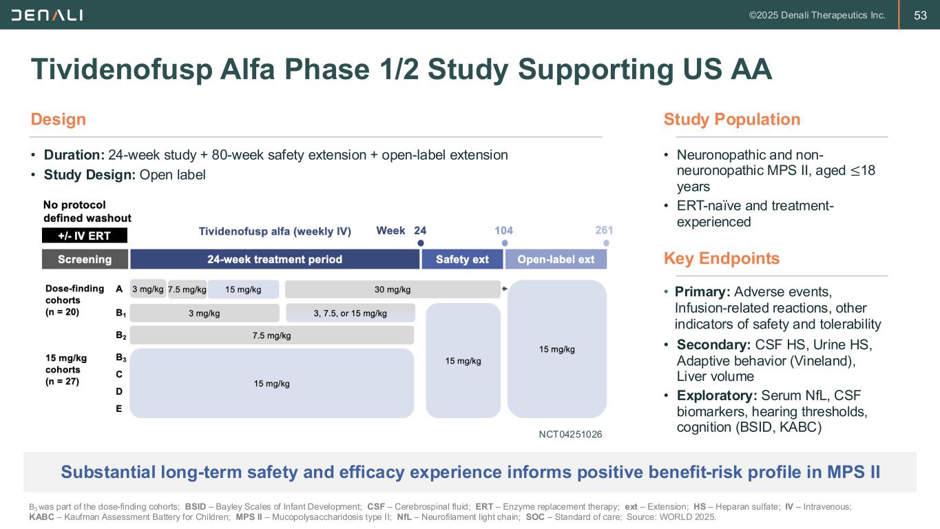 52 Brain Delivery Is Critical Unmet Need of Hunter Syndrome Therapy Traditional enzyme replacement therapy does not cross the blood brain barrier and only partially addresses peripheral manifestations Tividenofusp alfa is a brain- penetrant ERT designed to reduce the substrate of IDS (heparan sulfate) throughout the body and treat neurocognitive and physical manifestations Monogenic lysosomal storage disorder caused by deficient iduronate-2-sulfatase (IDS) tividenofusp alfa (DNL310) ERT – Enzyme replacement therapy