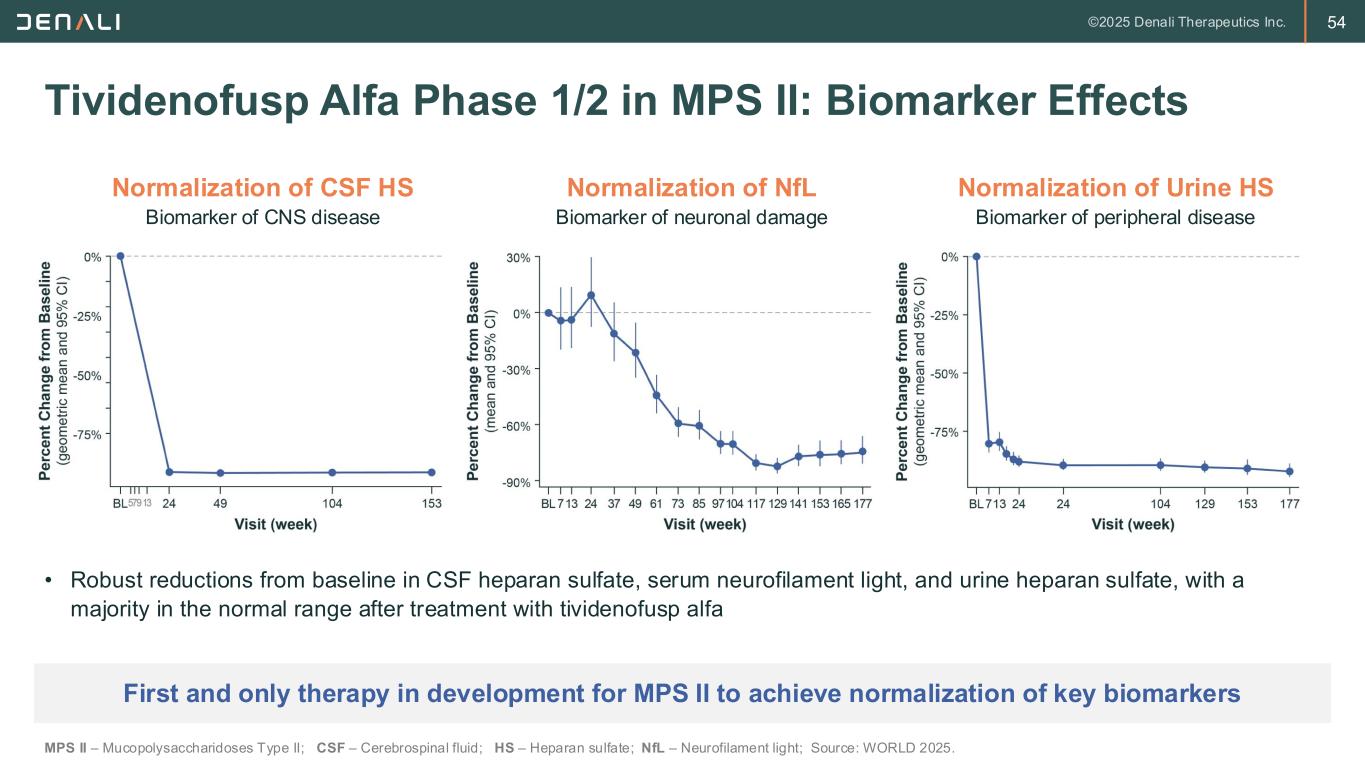 53 Tividenofusp Alfa Phase 1/2 Study Supporting US AA Substantial long-term safety and efficacy experience informs positive benefit-risk profile in MPS II NCT04251026 Design • Duration: 24-week study + 80-week safety extension + open-label extension • Study Design: Open label Study Population • Neuronopathic and non- neuronopathic MPS II, aged ≤18 years • ERT-naïve and treatment- experienced Key Endpoints • Primary: Adverse events, Infusion-related reactions, other indicators of safety and tolerability • Secondary: CSF HS, Urine HS, Adaptive behavior (Vineland), Liver volume • Exploratory: Serum NfL, CSF biomarkers, hearing thresholds, cognition (BSID, KABC) B3 was part of the dose-finding cohorts; BSID – Bayley Scales of Infant Development; CSF – Cerebrospinal fluid; ERT – Enzyme replacement therapy; ext – Extension; HS – Heparan sulfate; IV – Intravenous; KABC – Kaufman Assessment Battery for Children; MPS II – Mucopolysaccharidosis type II; NfL – Neurofilament light chain; SOC – Standard of care; Source: WORLD 2025.