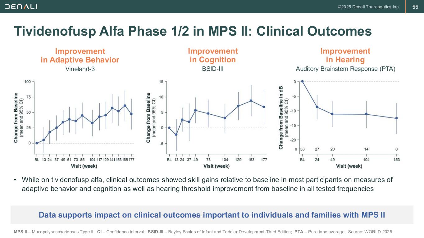 54 • Robust reductions from baseline in CSF heparan sulfate, serum neurofilament light, and urine heparan sulfate, with a majority in the normal range after treatment with tividenofusp alfa Tividenofusp Alfa Phase 1/2 in MPS II: Biomarker Effects MPS II – Mucopolysaccharidoses Type II; CSF – Cerebrospinal fluid; HS – Heparan sulfate; NfL – Neurofilament light; Source: WORLD 2025. First and only therapy in development for MPS II to achieve normalization of key biomarkers Normalization of Urine HS Biomarker of peripheral disease Normalization of NfL Biomarker of neuronal damage Normalization of CSF HS Biomarker of CNS disease