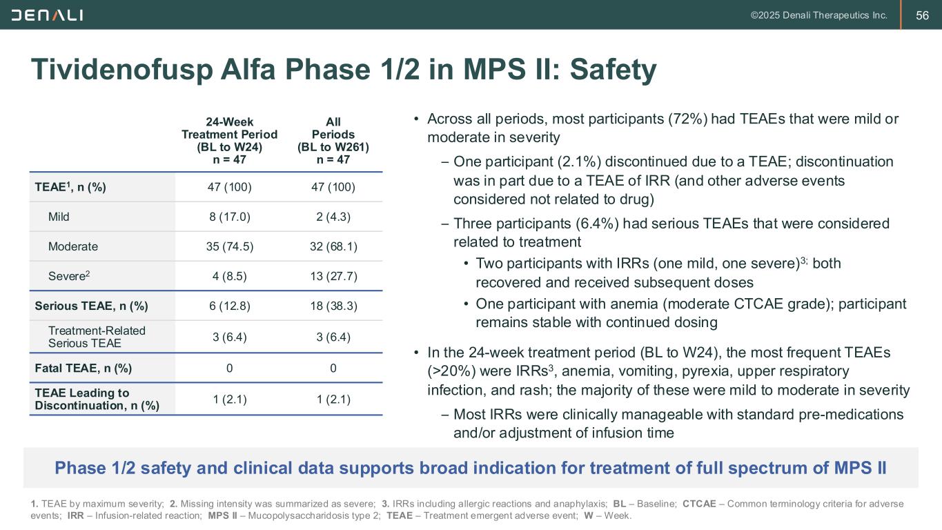 55 Improvement in Adaptive Behavior Vineland-3 Improvement in Cognition BSID-III Improvement in Hearing Auditory Brainstem Response (PTA) • While on tividenofusp alfa, clinical outcomes showed skill gains relative to baseline in most participants on measures of adaptive behavior and cognition as well as hearing threshold improvement from baseline in all tested frequencies Tividenofusp Alfa Phase 1/2 in MPS II: Clinical Outcomes MPS II – Mucopolysaccharidoses Type II; CI – Confidence interval; BSID-III – Bayley Scales of Infant and Toddler Development-Third Edition; PTA – Pure tone average; Source: WORLD 2025. Data supports impact on clinical outcomes important to individuals and families with MPS II
