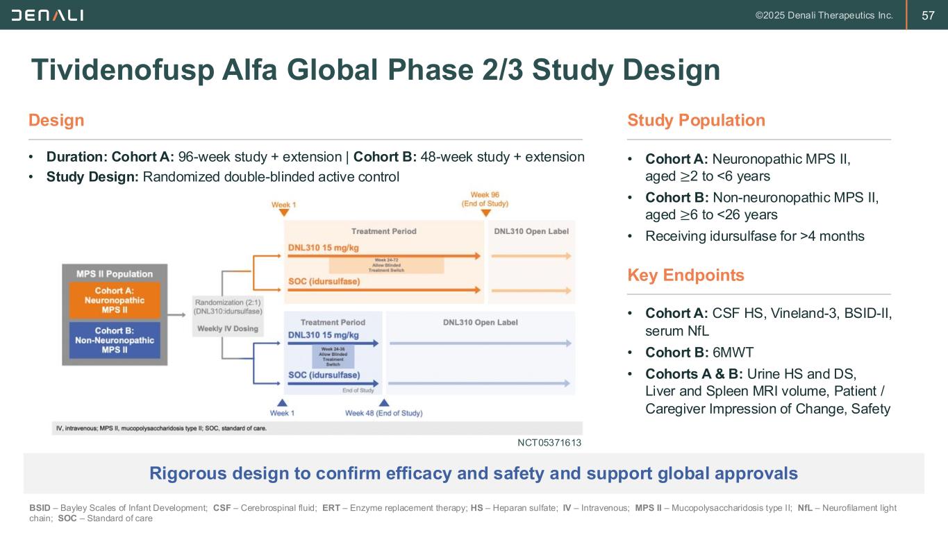 56 24-Week Treatment Period (BL to W24) n = 47 All Periods (BL to W261) n = 47 TEAE1, n (%) 47 (100) 47 (100) Mild 8 (17.0) 2 (4.3) Moderate 35 (74.5) 32 (68.1) Severe2 4 (8.5) 13 (27.7) Serious TEAE, n (%) 6 (12.8) 18 (38.3) Treatment-Related Serious TEAE 3 (6.4) 3 (6.4) Fatal TEAE, n (%) 0 0 TEAE Leading to Discontinuation, n (%) 1 (2.1) 1 (2.1) • Across all periods, most participants (72%) had TEAEs that were mild or moderate in severity – One participant (2.1%) discontinued due to a TEAE; discontinuation was in part due to a TEAE of IRR (and other adverse events considered not related to drug) – Three participants (6.4%) had serious TEAEs that were considered related to treatment • Two participants with IRRs (one mild, one severe)3; both recovered and received subsequent doses • One participant with anemia (moderate CTCAE grade); participant remains stable with continued dosing • In the 24-week treatment period (BL to W24), the most frequent TEAEs (>20%) were IRRs3, anemia, vomiting, pyrexia, upper respiratory infection, and rash; the majority of these were mild to moderate in severity – Most IRRs were clinically manageable with standard pre-medications and/or adjustment of infusion time – Anemia-related adverse events generally improved over time Tividenofusp Alfa Phase 1/2 in MPS II: Safety 1. TEAE by maximum severity; 2. Missing intensity was summarized as severe; 3. IRRs including allergic reactions and anaphylaxis; BL – Baseline; CTCAE – Common terminology criteria for adverse events; IRR – Infusion-related reaction; MPS II – Mucopolysaccharidosis type 2; TEAE – Treatment emergent adverse event; W – Week. Phase 1/2 safety and clinical data supports broad indication for treatment of full spectrum of MPS II