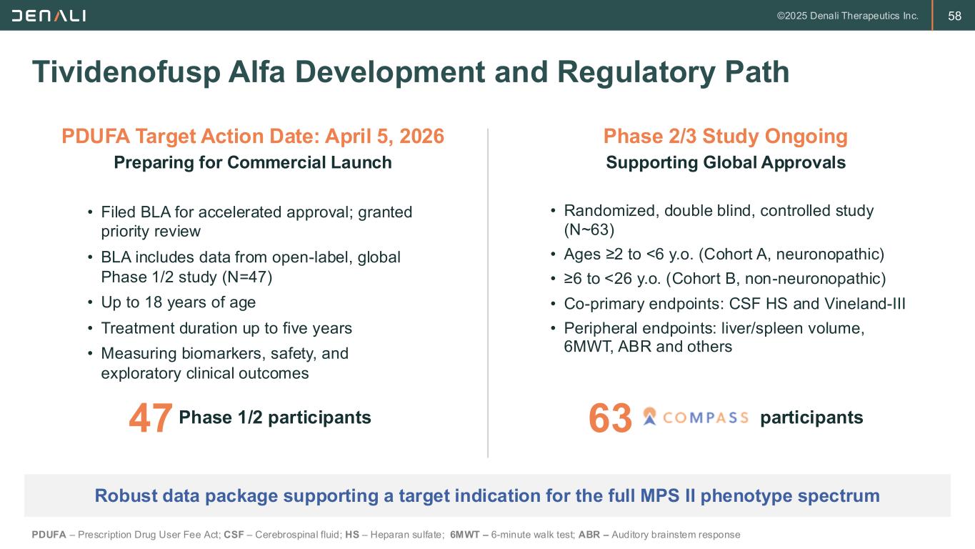 57 Study Population • Cohort A: Neuronopathic MPS II, aged ≥2 to <6 years • Cohort B: Non-neuronopathic MPS II, aged ≥6 to <26 years • Receiving idursulfase for >4 months Key Endpoints • Cohort A: CSF HS, Vineland-3, BSID-II, serum NfL • Cohort B: 6MWT • Cohorts A & B: Urine HS and DS, Liver and Spleen MRI volume, Patient / Caregiver Impression of Change, Safety Tividenofusp Alfa Global Phase 2/3 Study Design Rigorous design to confirm efficacy and safety and support global approvals NCT05371613 Design • Duration: Cohort A: 96-week study + extension | Cohort B: 48-week study + extension • Study Design: Randomized double-blinded active control BSID – Bayley Scales of Infant Development; CSF – Cerebrospinal fluid; ERT – Enzyme replacement therapy; HS – Heparan sulfate; IV – Intravenous; MPS II – Mucopolysaccharidosis type II; NfL – Neurofilament light chain; SOC – Standard of care