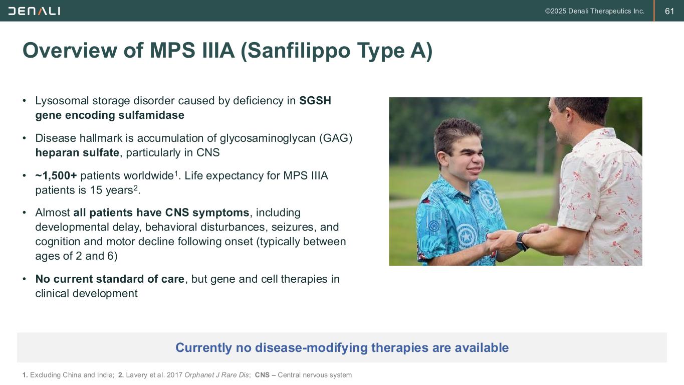 60 Tividenofusp Alfa is the Cornerstone of the ETV Franchise 1. Protocol amended and response to FDA submitted regarding clinical hold; US AA – United States Accelerated Approval; PDUFA – Prescription Drug User Fee Act; CSF – cerebrospinal fluid; IND – investigational new drug; TfR – transferrin receptor; GAA – acid alpha-glucosidase enzyme; LSD – lysosomal storage disorders The ETV franchise can deliver transformative treatments for the LSD community Immediate 2026 Near / Mid Term 2027 – 2028 Mid / Long Term 2028+ Clinical Value Potential Tividenofusp alfa (MPS II) First commercial launch US AA PDUFA April 5, 2026 Initial International Launches Full Global Potential • Only therapy shown to normalize disease biomarkers in CSF and periphery DNL126 (MPS IIIA) Path to US AA US AA Global Launch • Ability to normalize CSF heparan sulfate DNL952 (Pompe Disease) IND application filed1 Global Launch • TfR-enhanced delivery of GAA to muscle