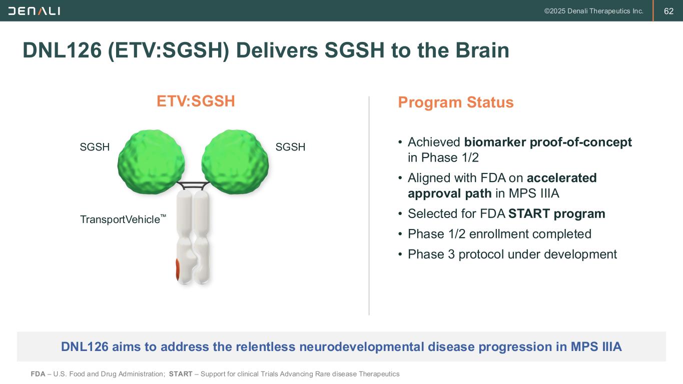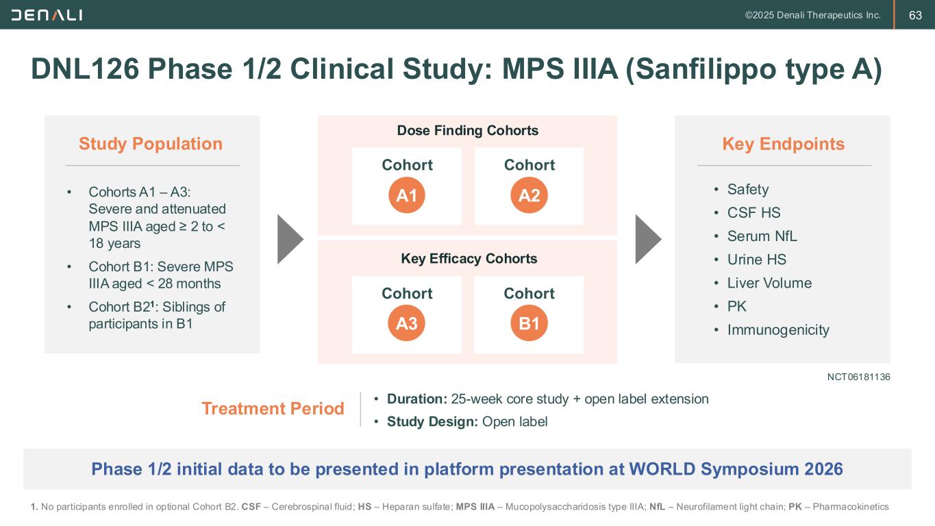 62 DNL126 (ETV:SGSH) Delivers SGSH to the Brain DNL126 aims to address the relentless neurodevelopmental disease progression in MPS IIIA TransportVehicle • Achieved biomarker proof-of-concept in Phase 1/2 • Aligned with FDA on accelerated approval path in MPS IIIA • Selected for FDA START program • Phase 1/2 enrollment completed • Phase 3 protocol under development Program Status SGSH ETV:SGSH SGSH FDA – U.S. Food and Drug Administration; START – Support for clinical Trials Advancing Rare disease Therapeutics