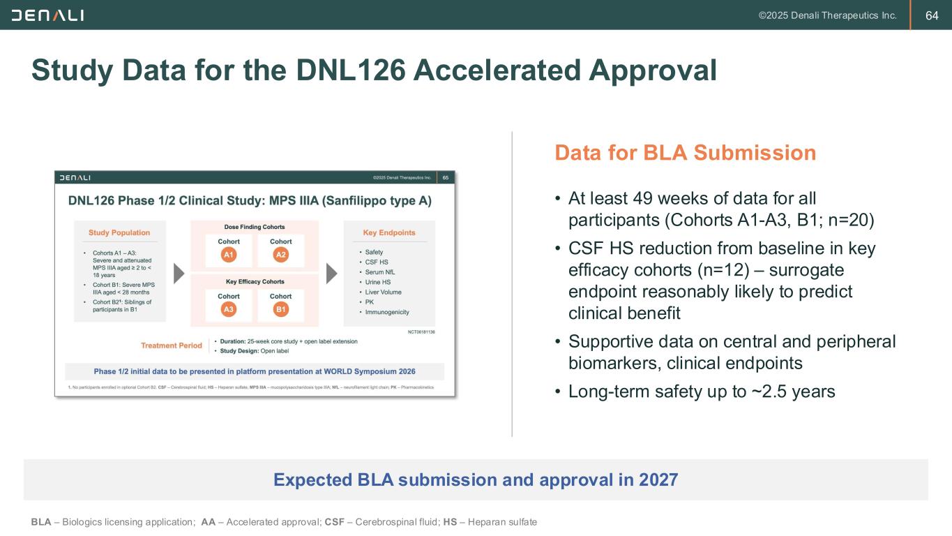 63 DNL126 Phase 1/2 Clinical Study: MPS IIIA (Sanfilippo type A) Phase 1/2 initial data to be presented in platform presentation at WORLD Symposium 2026 NCT06181136 Cohort A1• Cohorts A1 – A3: Severe and attenuated MPS IIIA aged ≥ 2 to < 18 years • Cohort B1: Severe MPS IIIA aged < 28 months • Cohort B21: Siblings of participants in B1 Study Population • Safety • CSF HS • Serum NfL • Urine HS • Liver Volume • PK • Immunogenicity Key Endpoints Dose Finding Cohorts Key Efficacy Cohorts Cohort A2 Cohort B1 Cohort A3 Treatment Period • Duration: 25-week core study + open label extension • Study Design: Open label 1. No participants enrolled in optional Cohort B2. CSF – Cerebrospinal fluid; HS – Heparan sulfate; MPS IIIA – Mucopolysaccharidosis type IIIA; NfL – Neurofilament light chain; PK – Pharmacokinetics
