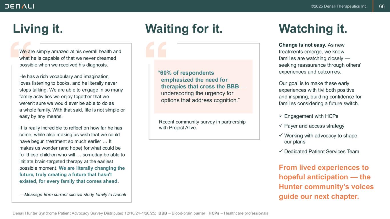 66 Living it. Denali Hunter Syndrome Patient Advocacy Survey Distributed 12/10/24-1/20/25; BBB – Blood-brain barrier; HCPs – Healthcare professionals Waiting for it. Watching it. – Message from current clinical study family to Denali ​ We are simply amazed at his overall health and what he is capable of that we never dreamed possible when we received his diagnosis. ​ He has a rich vocabulary and imagination, loves listening to books, and he literally never stops talking. We are able to engage in so many family activities we enjoy together that we weren't sure we would ever be able to do as a whole family. With that said, life is not simple or easy by any means. It is really incredible to reflect on how far he has come, while also making us wish that we could have begun treatment so much earlier … It makes us wonder (and hope) for what could be for those children who will … someday be able to initiate brain-targeted therapy at the earliest possible moment. We are literally changing the future, truly creating a future that hasn't existed, for every family that comes ahead. Recent community survey in partnership with Project Alive. Change is not easy. As new treatments emerge, we know families are watching closely — seeking reassurance through others’ experiences and outcomes. Our goal is to make these early experiences with tivi both positive and inspiring, building confidence for families considering a future switch. From lived experiences to hopeful anticipation — the Hunter community’s voices guide our next chapter. “60% of respondents emphasized the need for therapies that cross the BBB — underscoring the urgency for options that address cognition.” ✓ Engagement with HCPs ✓ Payer and access strategy ✓ Working with advocacy to shape our plans ✓ Dedicated Patient Services Team