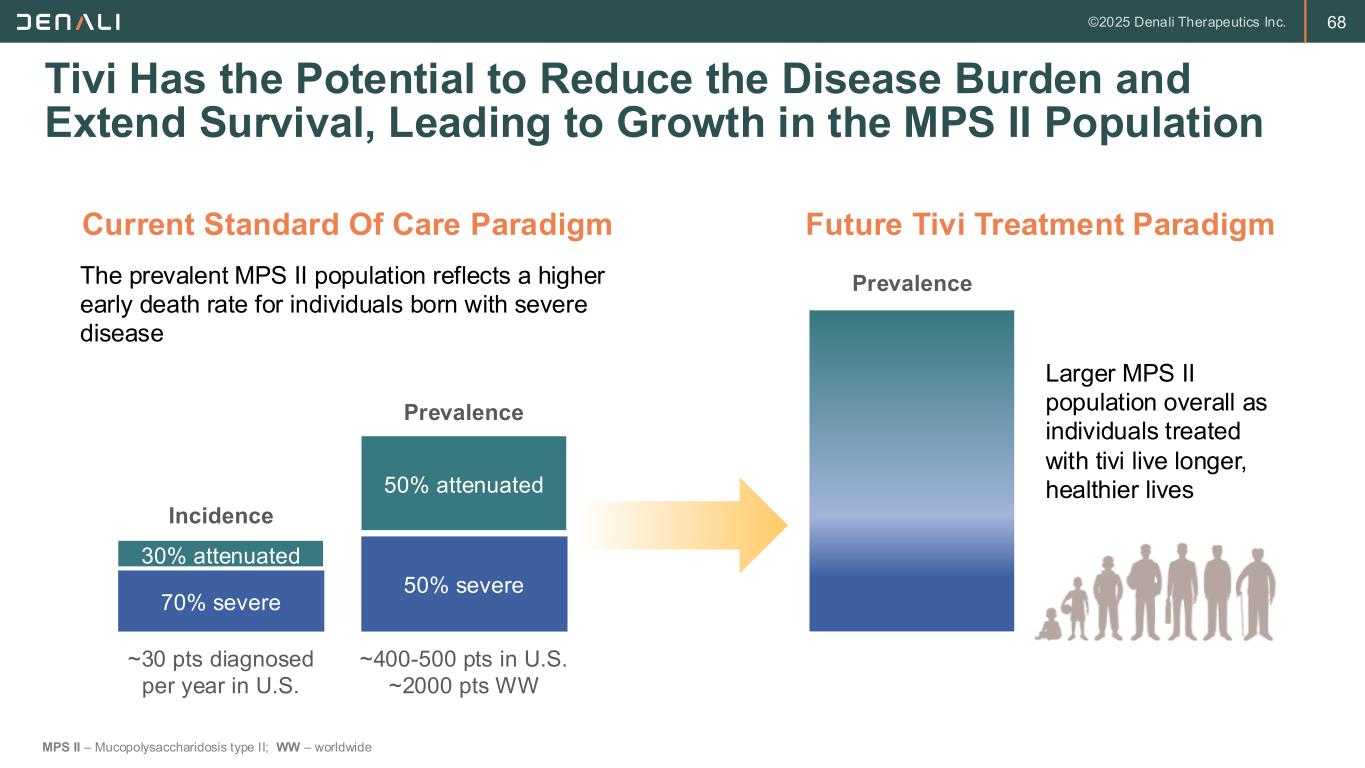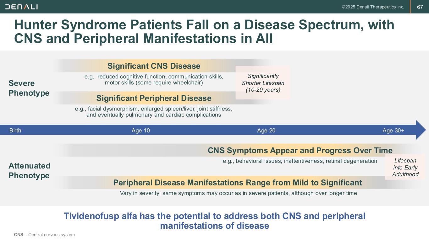 67 Hunter Syndrome Patients Fall on a Disease Spectrum, with CNS and Peripheral Manifestations in All Tividenofusp alfa has the potential to address both CNS and peripheral manifestations of disease Peripheral Disease Manifestations Range from Mild to Significant Vary in severity; same symptoms may occur as in severe patients, although over longer time CNS Symptoms Appear and Progress Over Time e.g., behavioral issues, inattentiveness, retinal degeneration Significant Peripheral Disease e.g., facial dysmorphism, enlarged spleen/liver, joint stiffness, and eventually pulmonary and cardiac complications Severe Phenotype Attenuated Phenotype Birth Age 10 Age 20 Age 30+ Significant CNS Disease e.g., reduced cognitive function, communication skills, motor skills (some require wheelchair) Significantly Shorter Lifespan (10-20 years) Lifespan into Early Adulthood CNS – Central nervous system