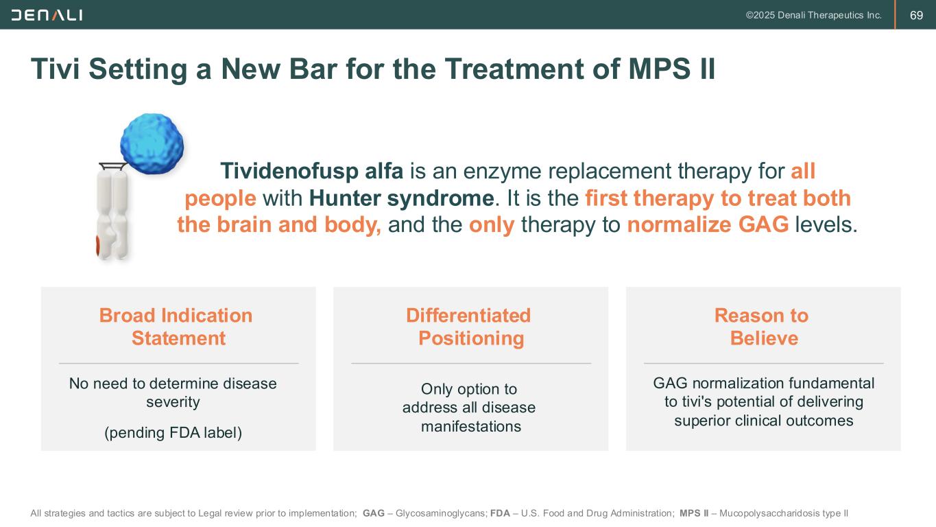 68 Tivi Has the Potential to Reduce the Disease Burden and Extend Survival, Leading to Growth in the MPS II Population 50% attenuated 50% severe 70% severe 30% attenuated Incidence Prevalence Current Standard Of Care Paradigm The prevalent MPS II population reflects a higher early death rate for individuals born with severe disease Future Tivi Treatment Paradigm Prevalence Larger MPS II population overall as individuals treated with tivi live longer, healthier lives ~30 pts diagnosed per year in U.S. ~400-500 pts in U.S. ~2000 pts WW MPS II – Mucopolysaccharidosis type II; WW – worldwide