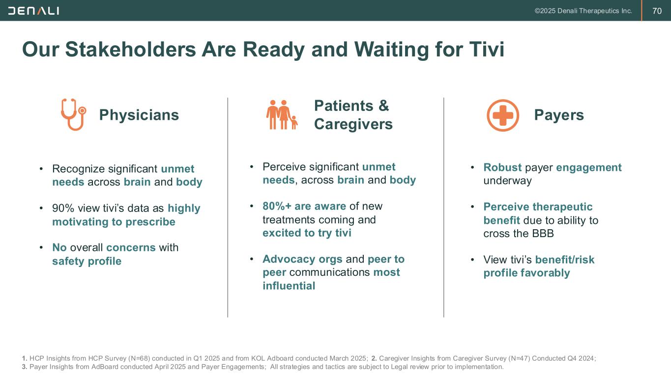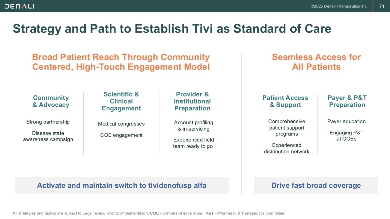 70 Our Stakeholders Are Ready and Waiting for Tivi 1. HCP Insights from HCP Survey (N=68) conducted in Q1 2025 and from KOL Adboard conducted March 2025; 2. Caregiver Insights from Caregiver Survey (N=47) Conducted Q4 2024; 3. Payer Insights from AdBoard conducted April 2025 and Payer Engagements; All strategies and tactics are subject to Legal review prior to implementation. Patients & Caregivers Payers • Recognize significant unmet needs across brain and body • 90% view tivi’s data as highly motivating to prescribe • No overall concerns with safety profile • Perceive significant unmet needs, across brain and body • 80%+ are aware of new treatments coming and excited to try tivi • Advocacy orgs and peer to peer communications most influential • Robust payer engagement underway • Perceive therapeutic benefit due to ability to cross the BBB • View tivi’s benefit/risk profile favorably Physicians