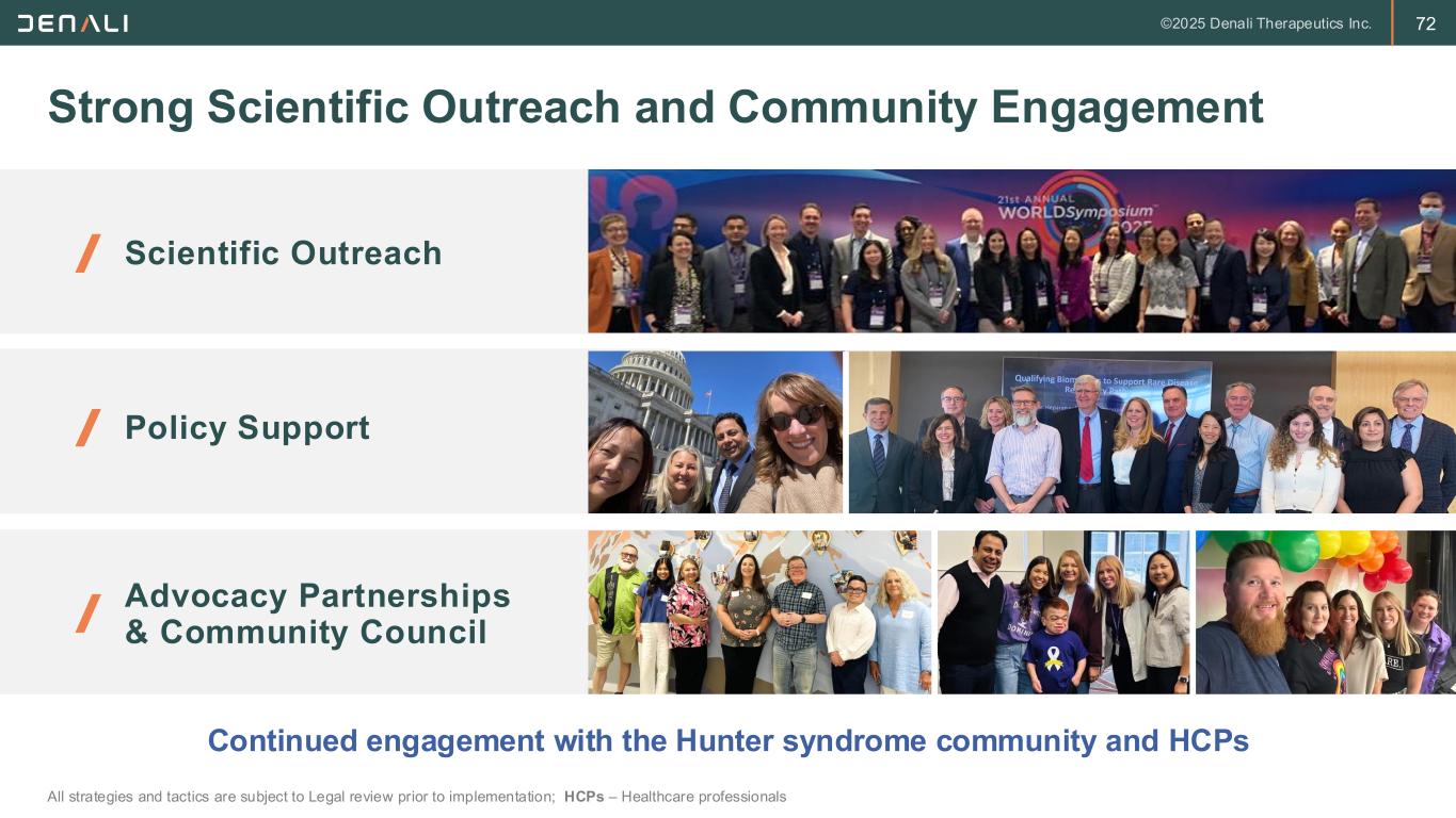 72 Strong Scientific Outreach and Community Engagement All strategies and tactics are subject to Legal review prior to implementation; HCPs – Healthcare professionals Continued engagement with the Hunter syndrome community and HCPs Scientific Outreach Advocacy Partnerships & Community Council Policy Support