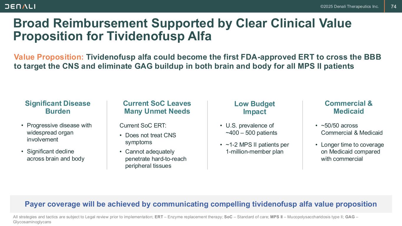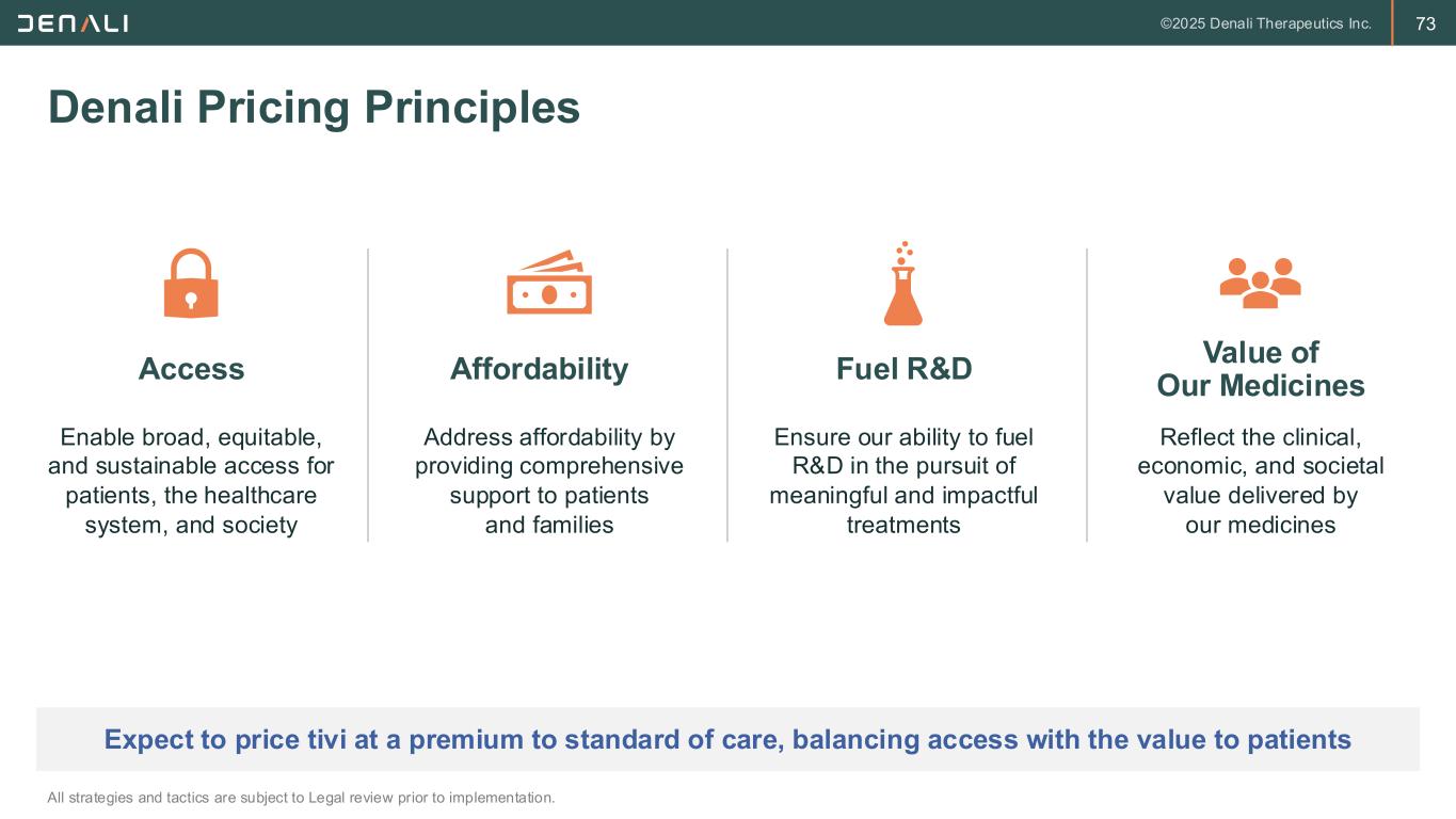 73 Denali Pricing Principles Expect to price tivi at a premium to standard of care, balancing access with the value to patients Access Enable broad, equitable, and sustainable access for patients, the healthcare system, and society Value of Our Medicines Reflect the clinical, economic, and societal value delivered by our medicines Affordability Address affordability by providing comprehensive support to patients and families Fuel R&D Ensure our ability to fuel R&D in the pursuit of meaningful and impactful treatments All strategies and tactics are subject to Legal review prior to implementation.