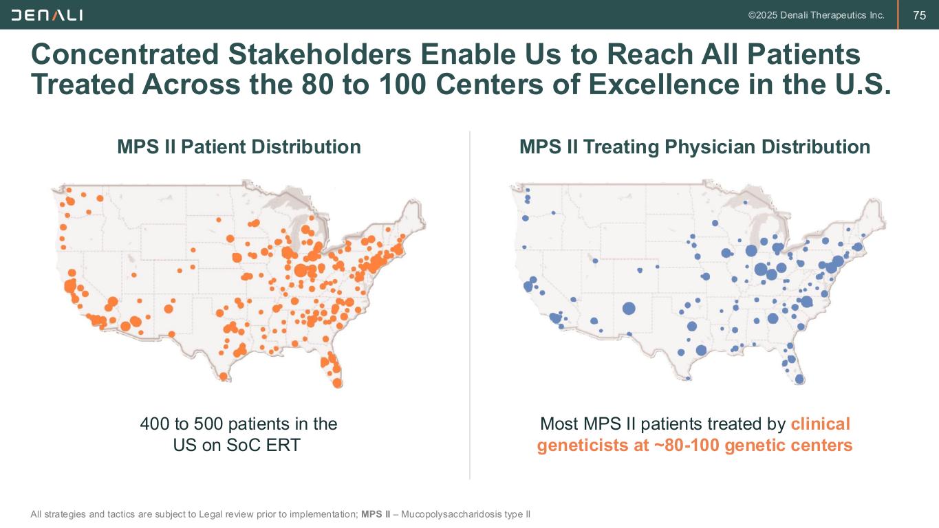 74 Broad Reimbursement Supported by Clear Clinical Value Proposition for Tividenofusp Alfa All strategies and tactics are subject to Legal review prior to implementation; ERT – Enzyme replacement therapy; SoC – Standard of care; MPS II – Mucopolysaccharidosis type II; GAG – Glycosaminoglycans • Progressive disease with widespread organ involvement • Significant decline across brain and body Significant Disease Burden Current SoC ERT: • Does not treat CNS symptoms • Cannot adequately penetrate hard-to-reach peripheral tissues Current SoC Leaves Many Unmet Needs • U.S. prevalence of ~400 – 500 patients • ~1-2 MPS II patients per 1-million-member plan Low Budget Impact • ~50/50 across Commercial & Medicaid • Longer time to coverage on Medicaid compared with commercial Commercial & Medicaid Value Proposition: Tividenofusp alfa could become the first FDA-approved ERT to cross the BBB to target the CNS and eliminate GAG buildup in both brain and body for all MPS II patients Payer coverage will be achieved by communicating compelling tividenofusp alfa value proposition