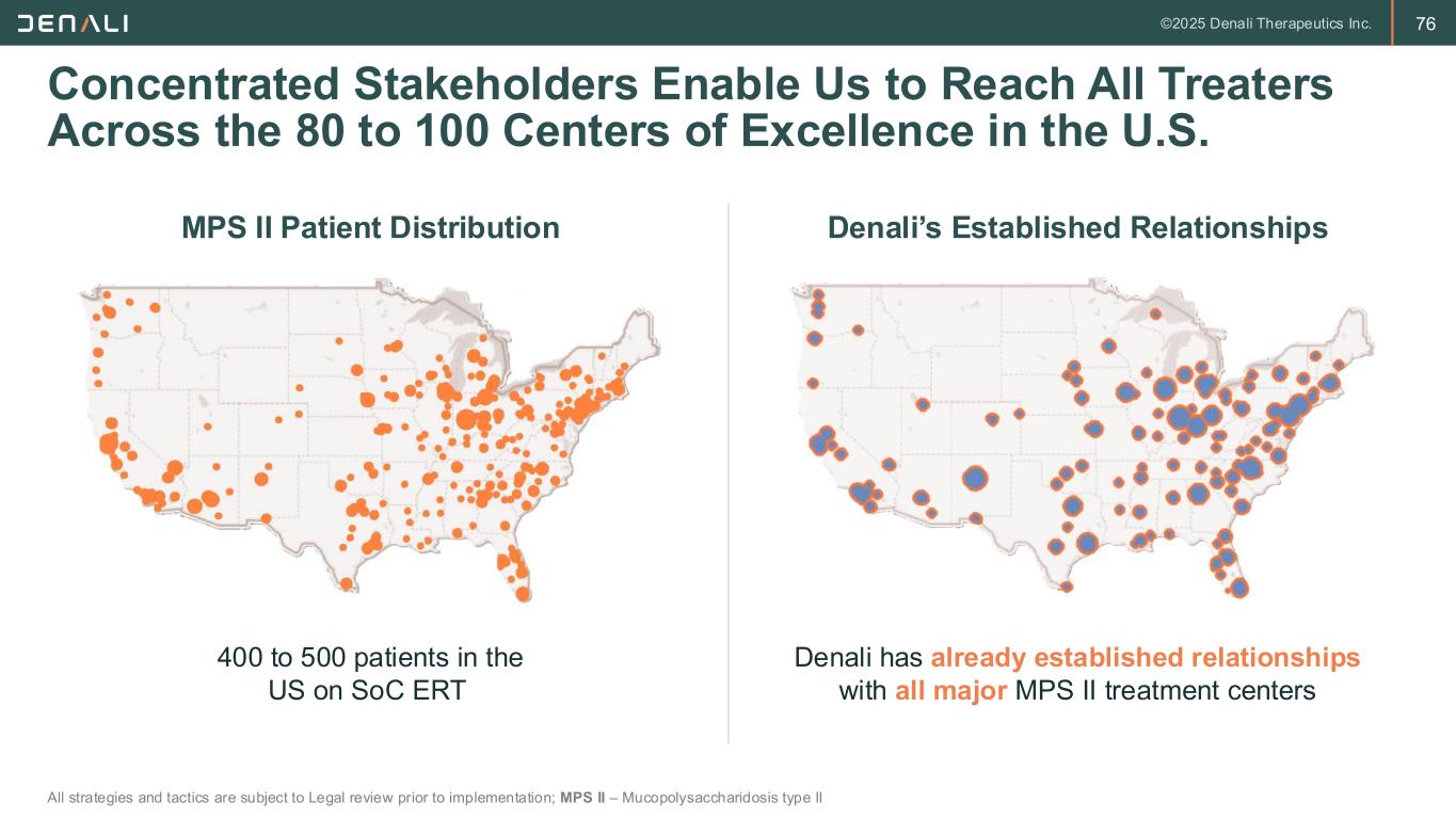 75 Concentrated Stakeholders Enable Us to Reach All Patients Treated Across the 80 to 100 Centers of Excellence in the U.S. All strategies and tactics are subject to Legal review prior to implementation; MPS II – Mucopolysaccharidosis type II 400 to 500 patients in the US on SoC ERT Most MPS II patients treated by clinical geneticists at ~80-100 genetic centers MPS II Patient Distribution MPS II Treating Physician Distribution