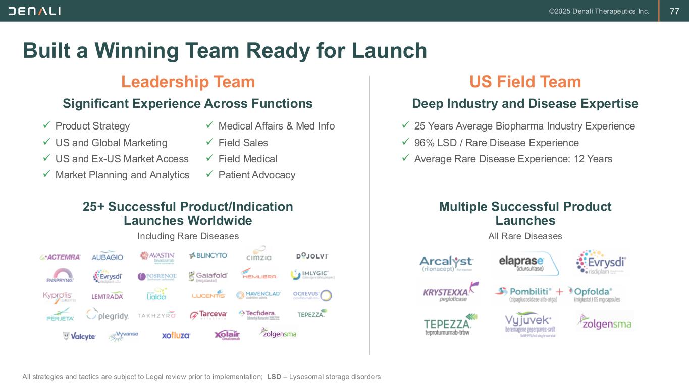 76 Concentrated Stakeholders Enable Us to Reach All Treaters Across the 80 to 100 Centers of Excellence in the U.S. All strategies and tactics are subject to Legal review prior to implementation; MPS II – Mucopolysaccharidosis type II 400 to 500 patients in the US on SoC ERT Denali has already established relationships with all major MPS II treatment centers MPS II Patient Distribution Denali’s Established Relationships