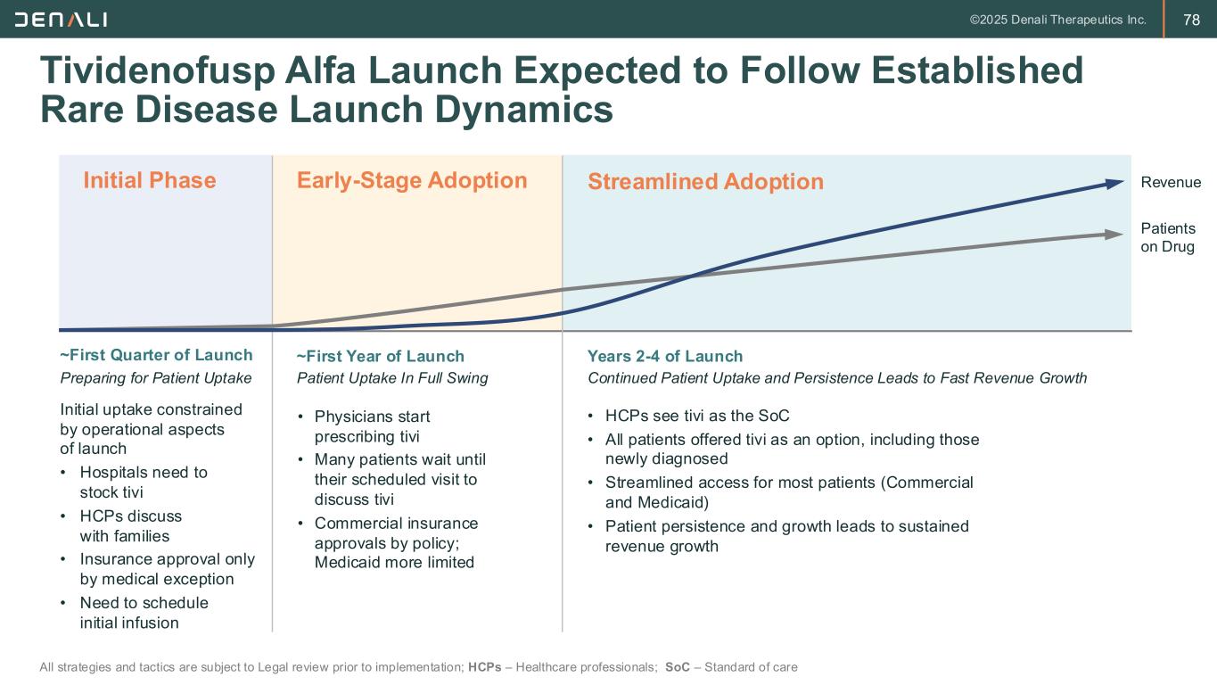 78 Tividenofusp Alfa Launch Expected to Follow Established Rare Disease Launch Dynamics All strategies and tactics are subject to Legal review prior to implementation; HCPs – Healthcare professionals; SoC – Standard of care • Physicians start prescribing tivi • Many patients wait until their scheduled visit to discuss tivi • Commercial insurance approvals by policy; Medicaid more limited Initial uptake constrained by operational aspects of launch • Hospitals need to stock tivi • HCPs discuss with families • Insurance approval only by medical exception • Need to schedule initial infusion • HCPs see tivi as the SoC • All patients offered tivi as an option, including those newly diagnosed • Streamlined access for most patients (Commercial and Medicaid) • Patient persistence and growth leads to sustained revenue growth ~First Quarter of Launch ~First Year of Launch Years 2-4 of Launch Initial Phase Early-Stage Adoption Streamlined Adoption Preparing for Patient Uptake Patient Uptake In Full Swing Continued Patient Uptake and Persistence Leads to Fast Revenue Growth Patients on Drug Revenue