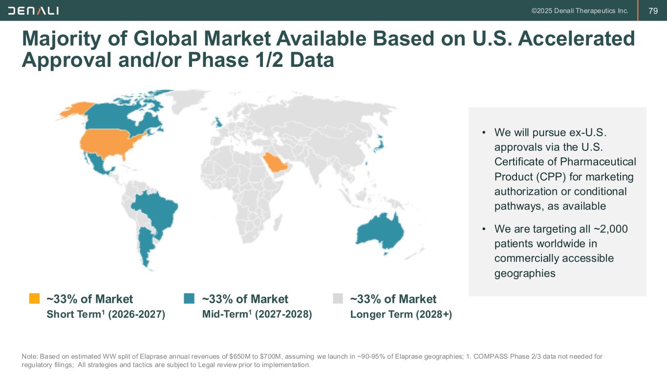 79 Majority of Global Market Available Based on U.S. Accelerated Approval and/or Phase 1/2 Data Note: Based on estimated WW split of Elaprase annual revenues of $650M to $700M, assuming we launch in ~90-95% of Elaprase geographies; 1. COMPASS Phase 2/3 data not needed for regulatory filings; All strategies and tactics are subject to Legal review prior to implementation. • We will pursue ex-U.S. approvals via the U.S. Certificate of Pharmaceutical Product (CPP) for marketing authorization or conditional pathways, as available • We are targeting all ~2,000 patients worldwide in commercially accessible geographies ~33% of Market ~33% of Market ~33% of Market Short Term1 (2026-2027) Mid-Term1 (2027-2028) Longer Term (2028+)