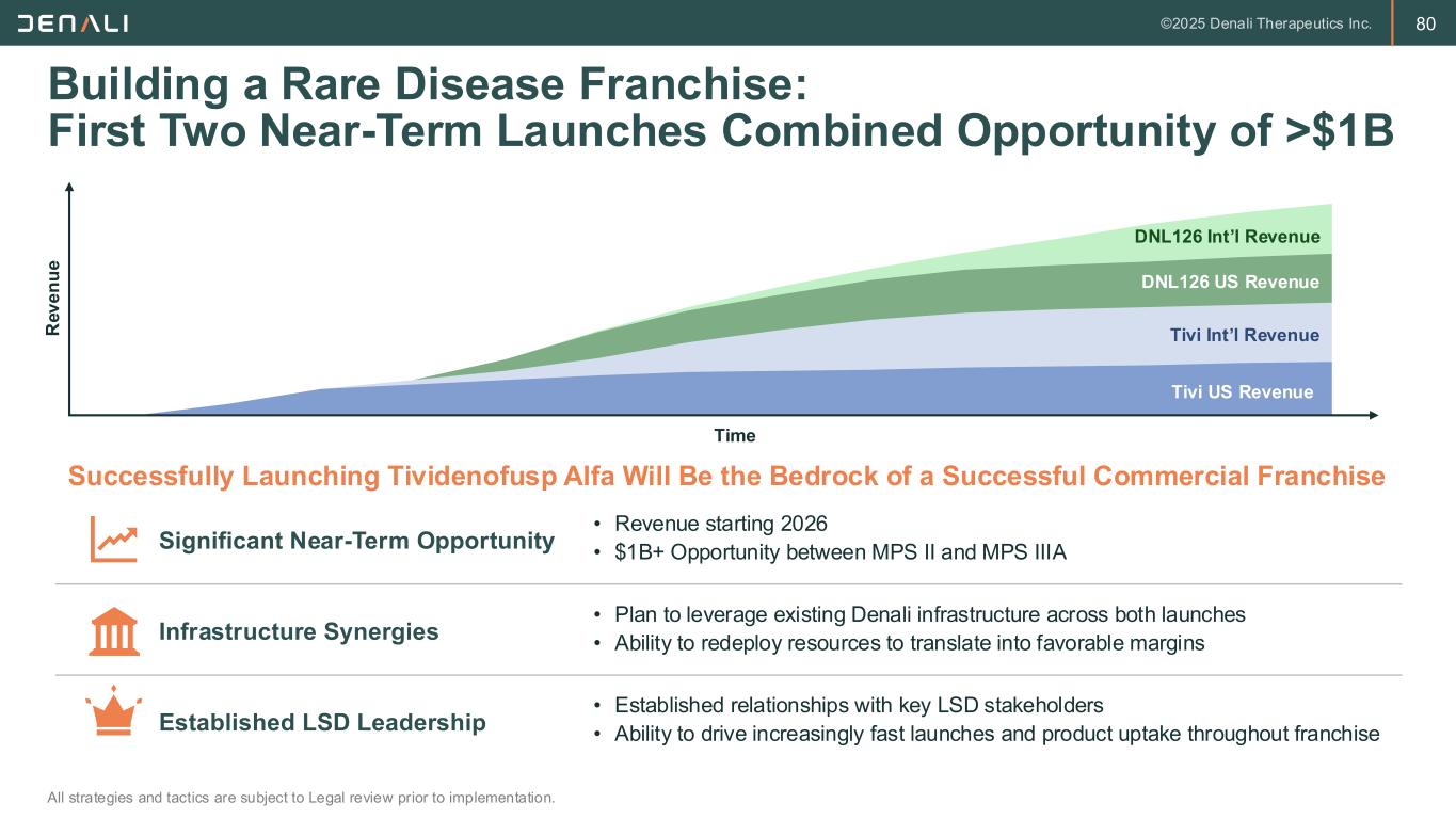 80 Building a Rare Disease Franchise: First Two Near-Term Launches Combined Opportunity of >$1B All strategies and tactics are subject to Legal review prior to implementation. Tivi US Revenue Tivi Int’l Revenue DNL126 US Revenue DNL126 Int’l Revenue Successfully Launching Tividenofusp Alfa Will Be the Bedrock of a Successful Commercial Franchise Significant Near-Term Opportunity Infrastructure Synergies Established LSD Leadership • Revenue starting 2026 • $1B+ Opportunity between MPS II and MPS IIIA • Plan to leverage existing Denali infrastructure across both launches • Ability to redeploy resources to translate into favorable margins • Established relationships with key LSD stakeholders • Ability to drive increasingly fast launches and product uptake throughout franchise R e v e n u e Time